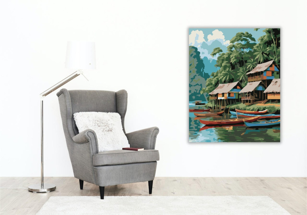 Amazonasi Cölöpfalu a Folyó Partján - számfestő készlet - Számfestő.hu - 40×50cm - keret nélkül