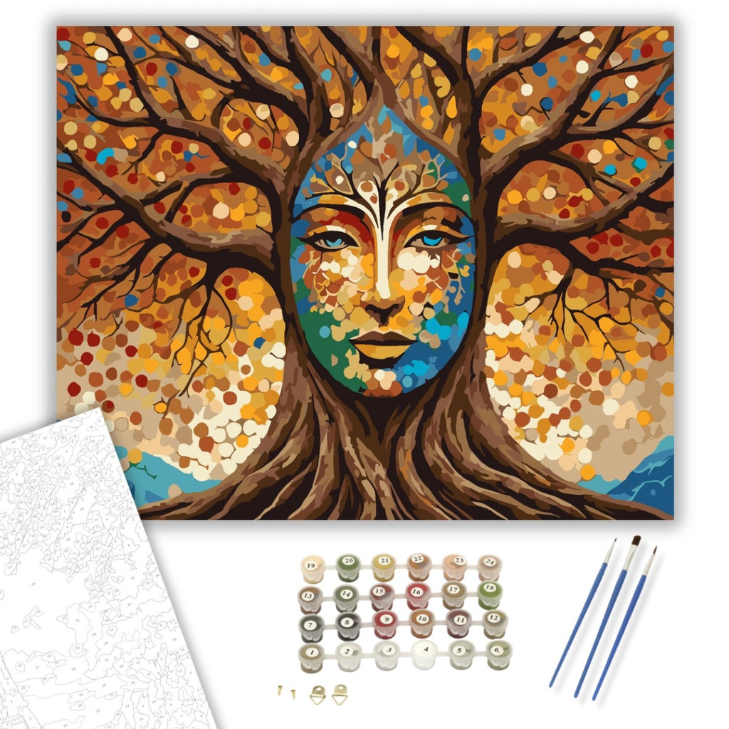 A festmény egy fa törzsét ábrázolja, amelyben egy emberi arc tűnik fel, a törzs anyagszerű barkás textúrájával. A fa ágai színes pontokkal és arany levelekkel díszítve nyúlnak szét, élénk színvilágot teremtve. A kép a természet és az emberi lélek közötti kapcsolatot sugározza, misztikus és harmonikus hangulatot idézve. Legyen a lakásod dísze vagy egy kedves meglepetés valaki számára – ez a számfestő készlet tökéletes választás mindkettőre. A készletben mindent megtalálsz, amivel lépésről lépésre megalkotható ez a gyönyörű festmény.