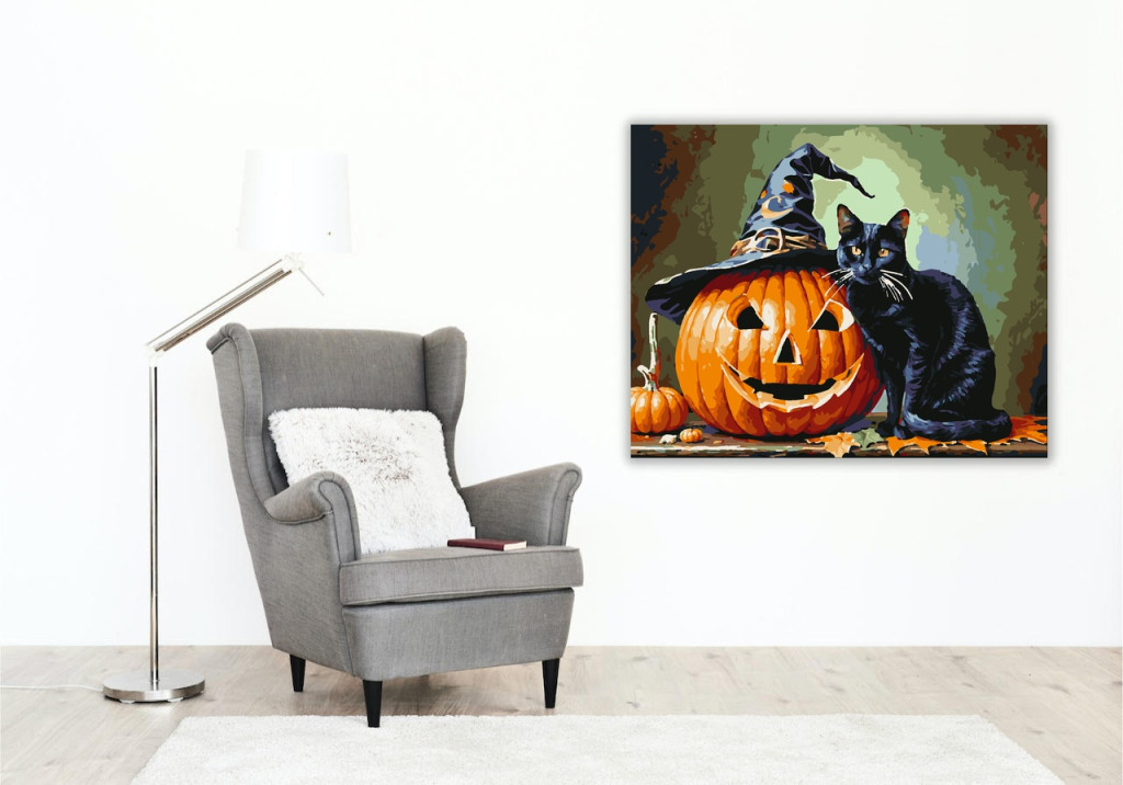 Boszorkánykalapos macska és töklámpás - számfestő készlet – 40×50 cm (Keretre feszítve)