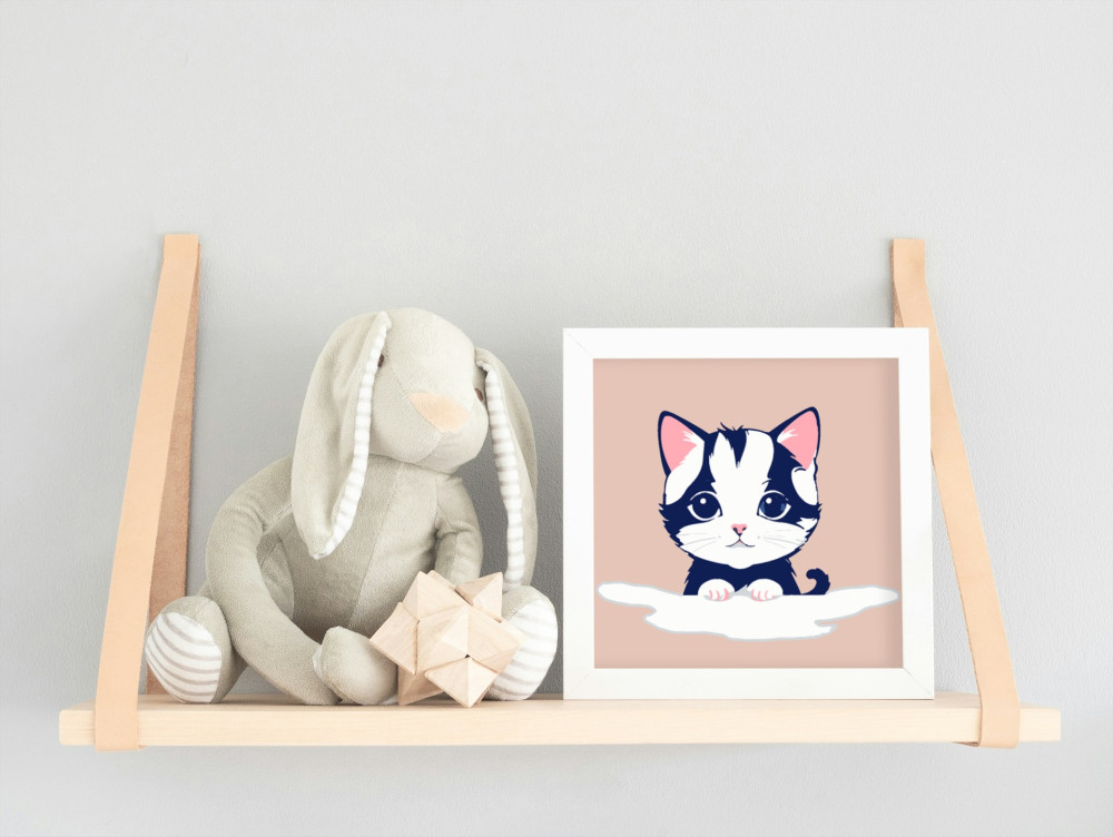 Ez a kép egy bájos kiscicát mutat, aki vidáman pihen egy puha felhőn. A szelíd rózsaszín és fehér árnyalatok igazi álomvilágot teremtenek. Tökéletes választás a gyerekek első kreatív kalandjához!