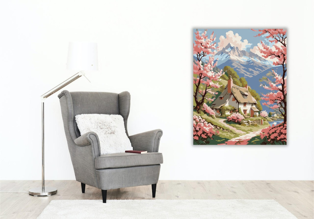 Cseresznyevirágos Völgy és Hegyi Kunyhó - számfestő készlet – 60×70 cm (Keret nélkül)