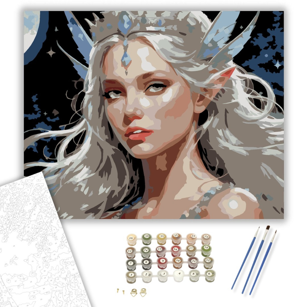 A festmény egy holdfényben ragyogó tündért ábrázol, akinek bőre halvány és fénylő, szemei ezüstösen csillognak, fején apró csillagokból álló korona lebeg. Az éjszakai égbolt sötétkék és ezüst árnyalatai varázslatos, misztikus hangulatot teremtenek. A kép ámulatba ejt, és a nézőt az álmok világába hívja. Engedd szabadjára a kreativitásodat, és alkoss egy különleges műalkotást, amely otthonod dísze lehet de egyedi ajándékként is kiváló. A számfestő készletben minden szükséges eszközt megtalálsz a tökéletes végeredményhez.