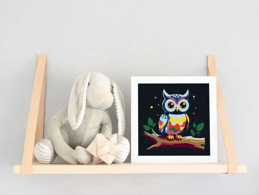 Ez a kép egy kedves éjszakai bagolyka csücsül egy ágon, színes tollai vidáman ragyognak a csillagos ég alatt. A bájos színek és formák igazán barátságos légkört teremtenek. Tökéletes választás a gyerekek első kreatív kalandjához!