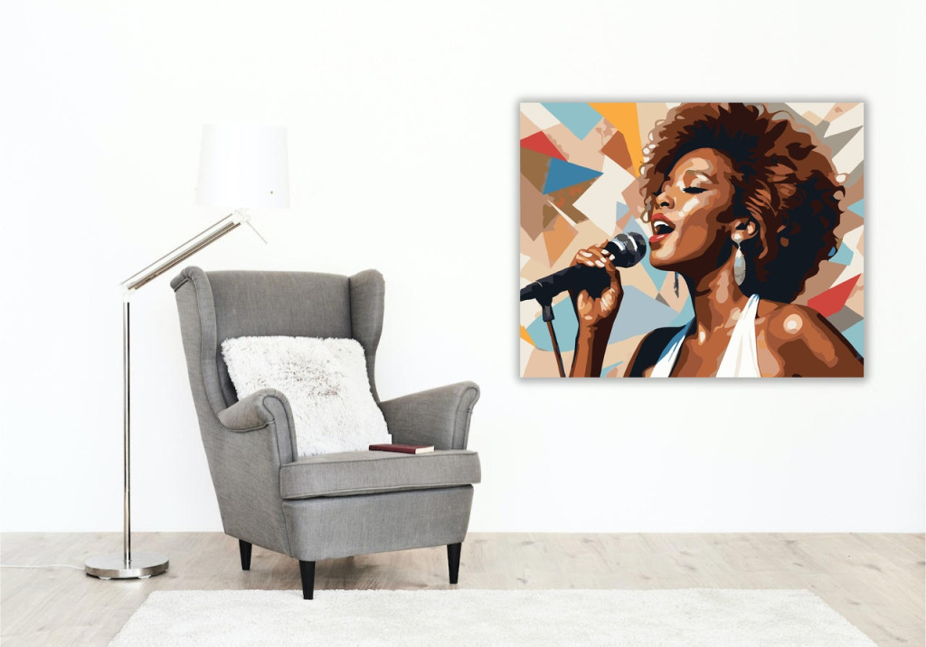 A festmény egy énekesnőt ábrázol, aki szenvedélyesen énekel mikrofonba, csukott szemekkel és kifejező arckifejezéssel. Az élénk színek és geometrikus háttér dinamikus, modern stílust kölcsönöz a képnek. A kompozíció erőt és érzelmi intenzitást sugároz, amely magával ragadja a nézőt. Engedd szabadjára a kreativitásodat, és alkoss egy különleges műalkotást, amely otthonod dísze lehet de egyedi ajándékként is kiváló. A számfestő készletben minden szükséges eszközt megtalálsz a tökéletes végeredményhez.