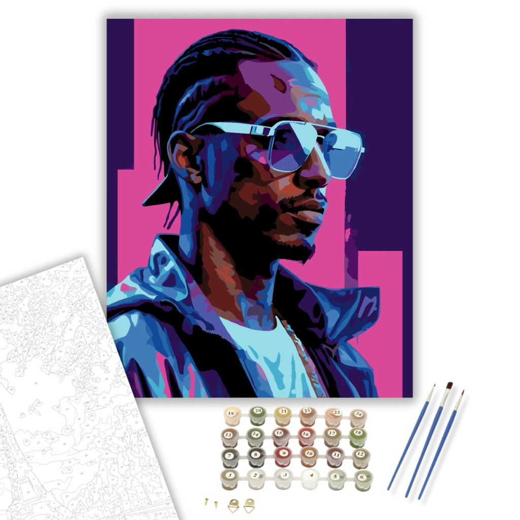 A festmény egy futurisztikus stílusú zenész portréját ábrázolja, holografikus szemüveggel és neon árnyalatokkal. A vibráló lila és kék tónusok modern, cyberpunk hangulatot hoznak létre. A kép dinamikus energiát és jövőbeli esztétikát sugároz. Díszítsd otthonodat saját kézzel készített műalkotással, vagy ajándékozd meg szeretteidet egy igazán különleges élménnyel! A számfestő készletben minden szükséges eszköz megtalálható a festmény elkészítéséhez.