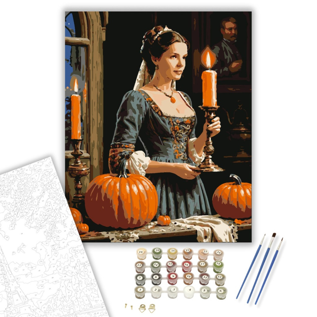 Ez a festmény egy elegáns, régi stílusú ruhába öltözött hölgyet ábrázol, aki egy égő gyertyát tart a kezében. A háttérben tökök és egy rejtélyes portré tűnnek fel, mindezt meleg, lágy gyertyafény világítja meg. A részletek finom kidolgozása és a lágy színek festése egyedi festési élményt kínál. A kész mű elegáns dekoráció lehet az őszi vagy halloween-i időszakban. A csomag minden szükséges eszközt és alapanyagot tartalmaz, hogy azonnal elkezdhesd a festést.