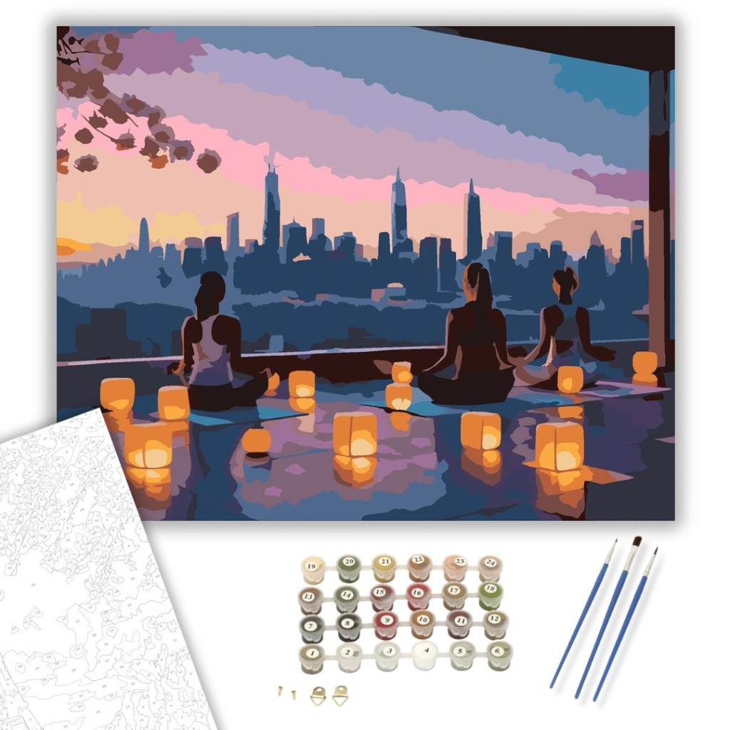 Jóga a Városi Kilátással - számfestő készlet - Számfestő.hu - 60×70cm - keretre feszítve