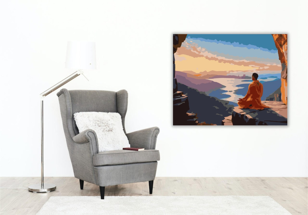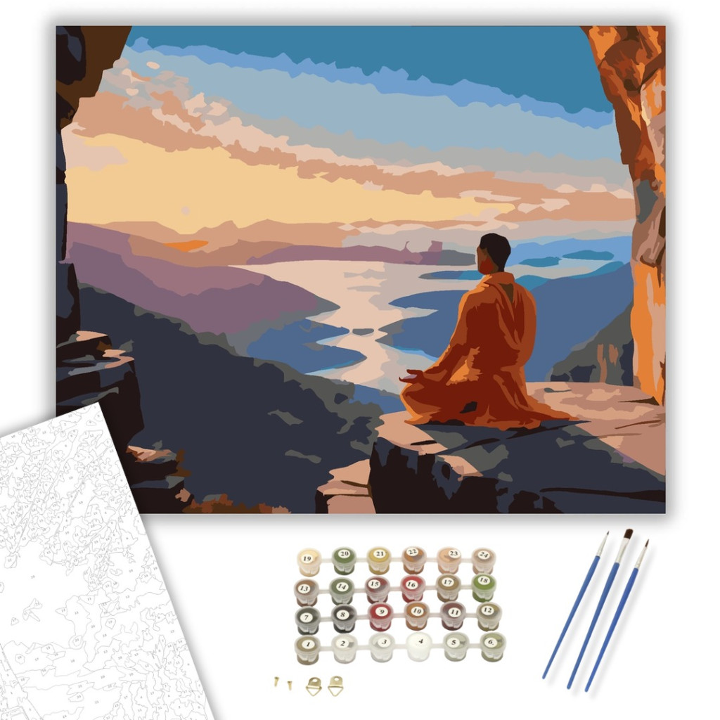 A festmény egy jógit ábrázol padmasana pózban, egy szikla peremén napfelkeltekor, háttérben a távoli hegyekkel és völgyekkel. A kép élénk narancs és kék árnyalatokkal festi le a hajnali égbolt és a föld találkozását, nyugalmat és harmóniát sugározva. A kompozíció a meditáció mélységét és a természet csodálatos szépségét közvetíti. Engedd szabadjára a kreativitásodat, és alkoss egy különleges műalkotást, amely otthonod dísze lehet de egyedi ajándékként is kiváló. A számfestő készletben minden szükséges eszközt megtalálsz a tökéletes végeredményhez.