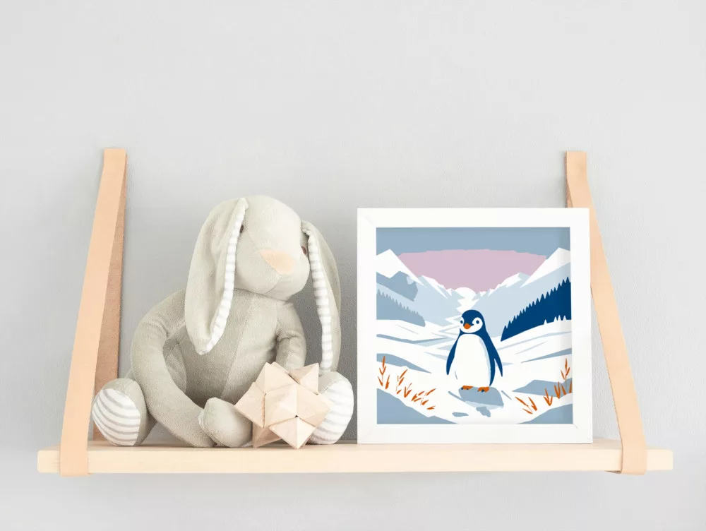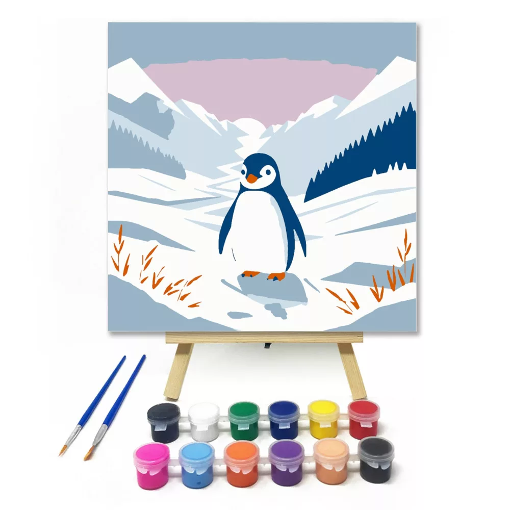 Ez a kép egy kedves kis pingvint ábrázol, aki vidáman sétál a hófödte tájon. A hűvös kék és meleg narancs színek barátságos hangulatot sugároznak. Tökéletes társ a gyerekek első kreatív kalandjához!