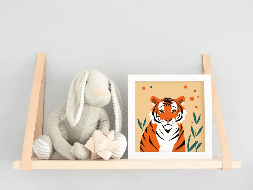Ez a kép egy kedves kis tigrist ábrázol, aki barátságosan néz ránk a dzsungel virágai közül. A vidám narancssárga és zöld színek életre keltik a tigris játékos világát. Tökéletes választás a gyerekek első festős kalandjához!
