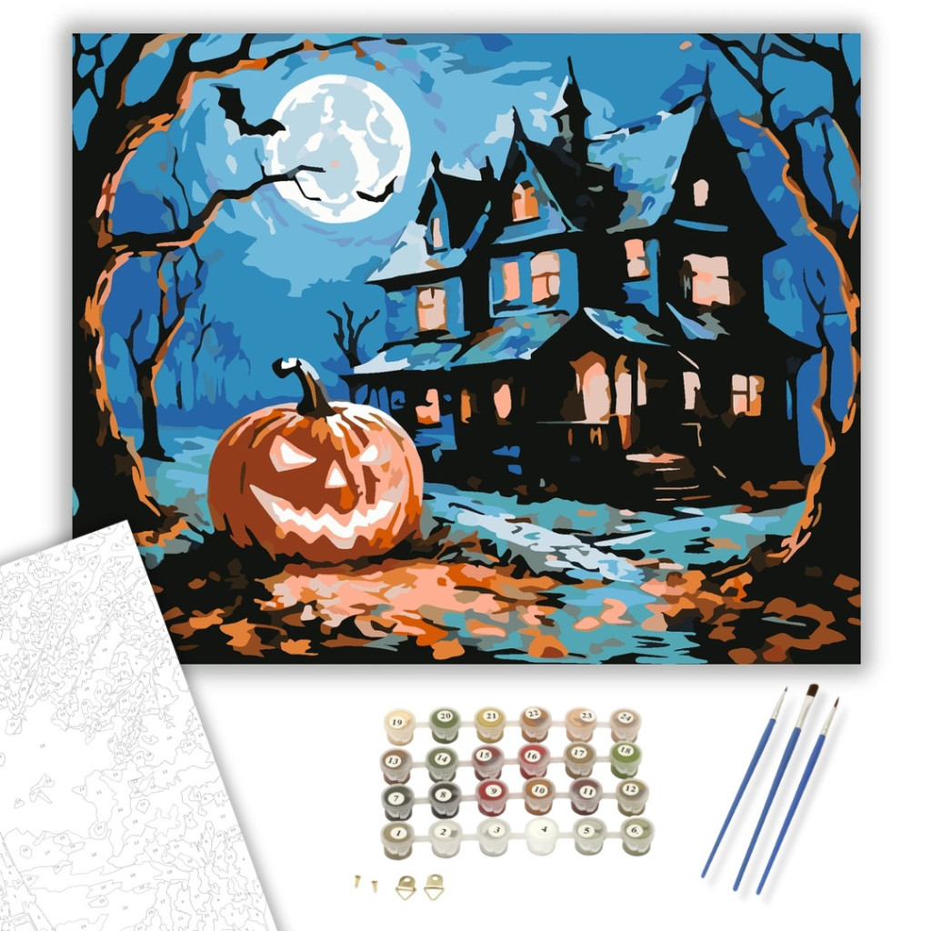 Kísértetjárta ház és faragott tök - számfestő készlet – 50×60 cm (Keret nélkül)