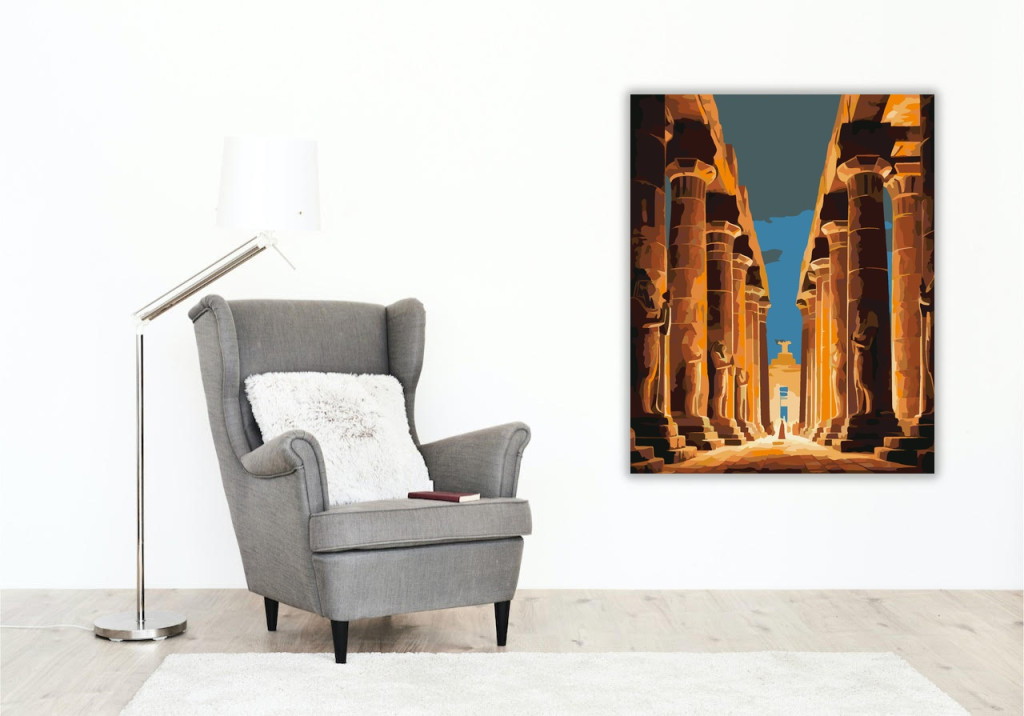 A festmény a luxori ókori egyiptomi templomkomplexumot ábrázolja, toronymagas oszlopokkal és fáklyafényben ragyogó hieroglifákkal. A meleg narancssárga és a mély kék színek kontrasztja misztikus, időtlen hangulatot teremt. A kép az ókori Egyiptom monumentalitását és misztériumát közvetíti. Legyen a lakásod dísze vagy egy kedves meglepetés valaki számára – ez a számfestő készlet tökéletes választás mindkettőre. A készletben mindent megtalálsz, amivel lépésről lépésre megalkotható ez a gyönyörű festmény.