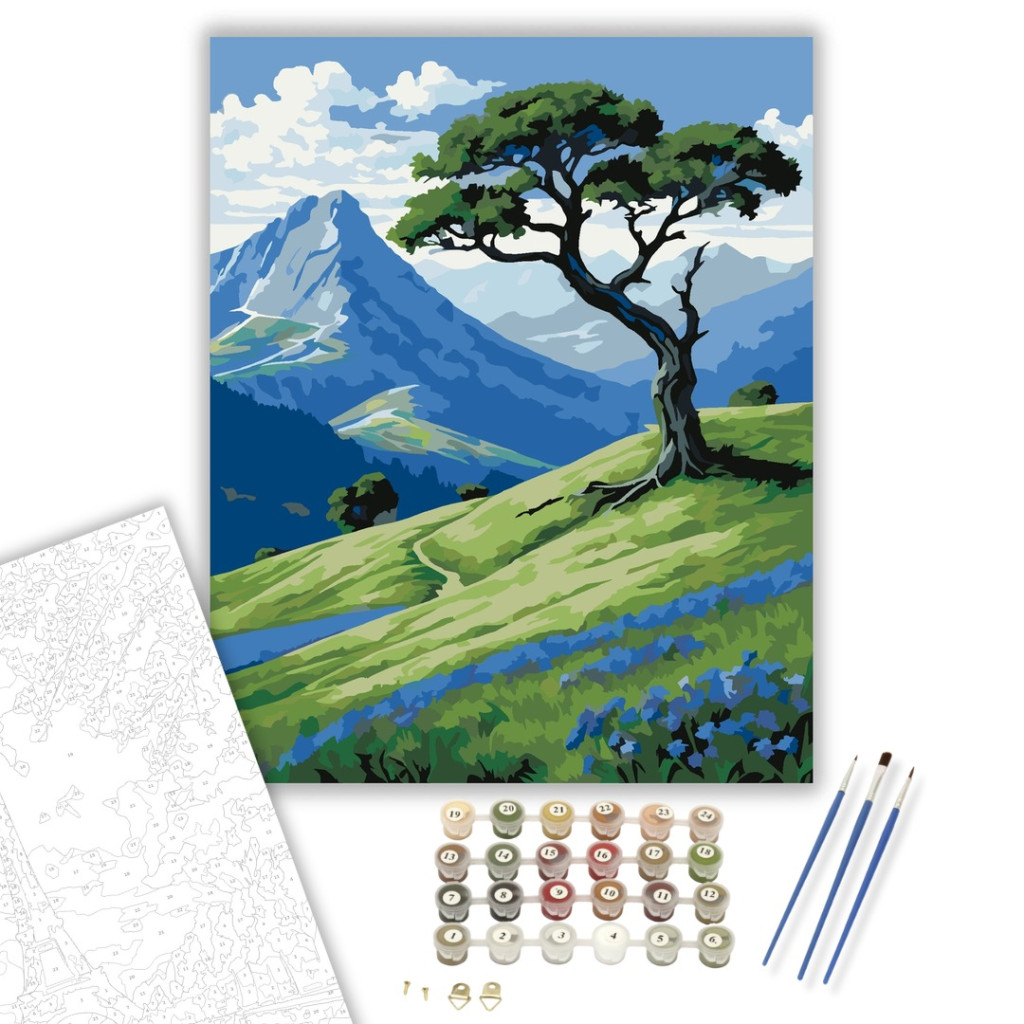 Magányos Fa és Kék Vadvirágos Völgy - számfestő készlet – 50×60 cm (Keret nélkül)