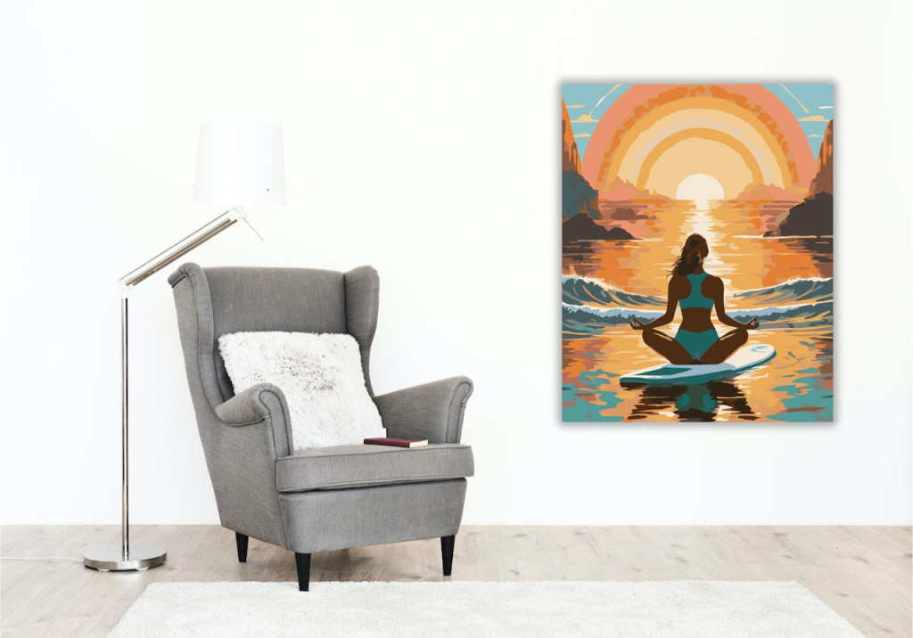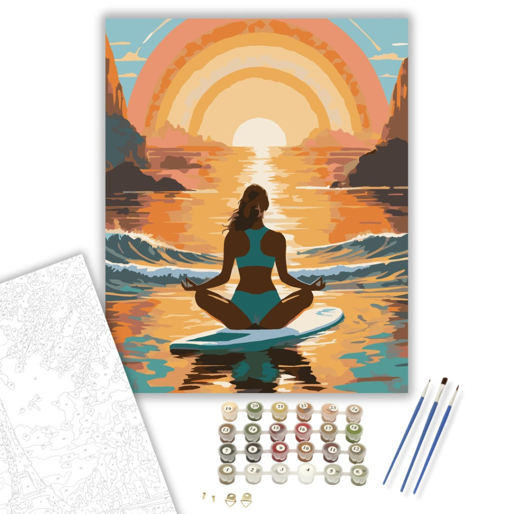 A festmény egy nőt ábrázol lótuszülésben egy paddleboardon, a nyílt tengeren, gyengéd hullámok közt, aranyóra fényében. Az élénk arany és kék színek harmonikus, nyugtató hangulatot teremtenek. A kép a belső béke megtalálását és a természethez való kapcsolódást sugallja. Ez a számfestő készlet tökéletes választás, ha egyedi dekorációval tennéd szebbé otthonodat, vagy ha különleges ajándékot keresel. A csomagban minden megtalálható, amire a festéshez szükséged van.
