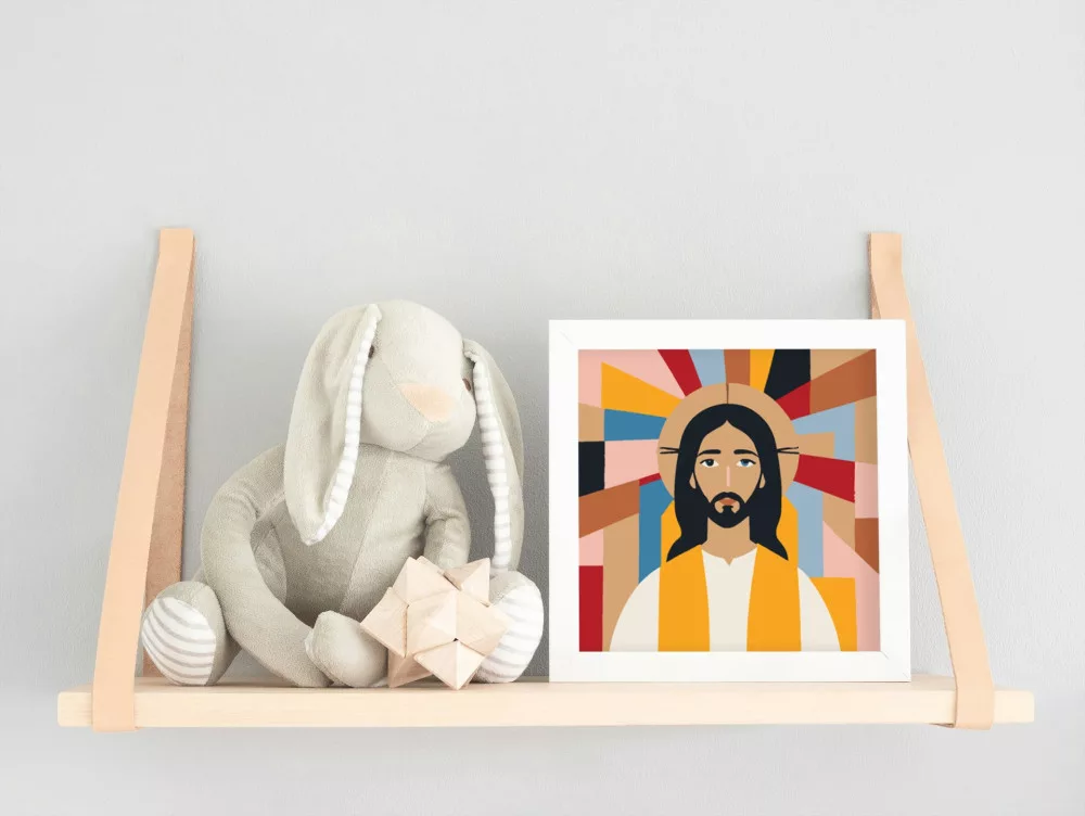 Ez a kép egy kedves és színes Megváltót ábrázol, aki békésen néz ránk, körülötte vidám sugarakkal. A meleg színek és a barátságos arc derűs hangulatot árasztanak. Tökéletes kezdés a gyerekek kreatív kalandjaihoz!