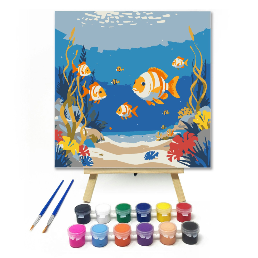Merülj el a tenger mélyén, ahol színes halacskák úszkálnak vidáman a korallok között! A kék és narancssárga színek vidám kavalkádja garantáltan elvarázsolja a kis festőket. Tökéletes első lépés a kreatív mélytengeri kalandok világába!