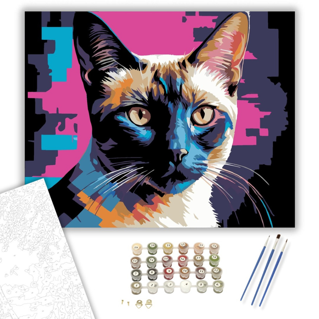A festmény egy sziámi macskát ábrázol, amelynek élénk sárga szemei és különböző színű, sima csíkokkal festett bundája van. Az alkotásban a cián, ibolya, flamingó rózsaszín és obszidián árnyalatok dinamikus, elektromos hangulatot keltenek. A kép modern, vibráló energiát sugároz, kiemelve a macska elegáns megjelenését. Díszítsd otthonodat saját kézzel készített műalkotással, vagy ajándékozd meg szeretteidet egy igazán különleges élménnyel! A számfestő készletben minden szükséges eszköz megtalálható a festmény elkészítéséhez.