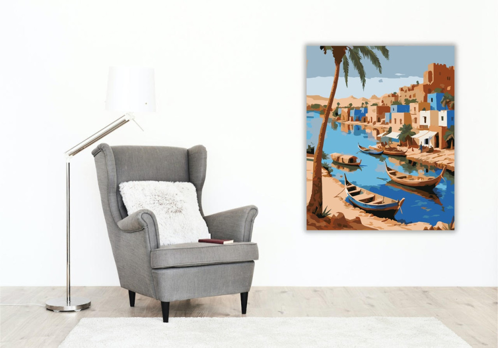 A festmény egy békés nubi falut ábrázol a Nílus partján, színes vályogtéglás házakkal, pálmafákkal és a folyó mentén kikötött tradicionális csónakokkal. A meleg földszínek és a ragyogó kék víz kontrasztja nyugodt, idilli hangulatot teremt. A kép a Nílus menti élet egyszerű szépségét és harmóniáját sugallja. Ez a számfestő készlet tökéletes választás, ha egyedi dekorációval tennéd szebbé otthonodat, vagy ha különleges ajándékot keresel. A csomagban minden megtalálható, amire a festéshez szükséged van.