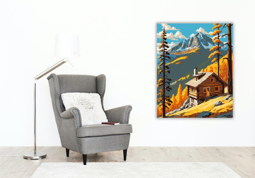 A kép egy hegyi faházat ábrázol az őszi táj közepén, háttérben a monumentális hegyekkel és színpompás erdőkkel. A meleg őszi színek és a finom ecsetkezelés tökéletesen kiemelik a természet nyugalmát és szépségét. Ez a festmény hűen megidézi a hegyek és völgyek művészi stílusának esszenciáját, a tér és friss levegő érzését. Díszítsd otthonodat saját kézzel készített műalkotással, vagy ajándékozd meg szeretteidet egy igazán különleges élménnyel! A számfestő készletben minden szükséges eszköz megtalálható a festmény elkészítéséhez.