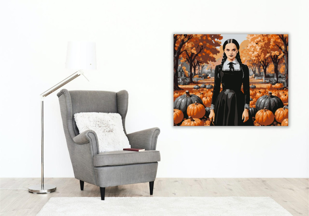Ez a festmény egy titokzatos lányt ábrázol, aki egy őszi tájban, narancs és szürke tökök között áll. A hátteret a lehullott őszi levelek és a csodás fák alkotják. A sötét tónusú ruha és a narancssárga levelek kontrasztja izgalmas festési élményt nyújt. A kész mű nemcsak dekoratív, hanem elgondolkodtató eleme lehet otthonodnak. A csomag minden szükséges eszközt és alapanyagot tartalmaz a festéshez.