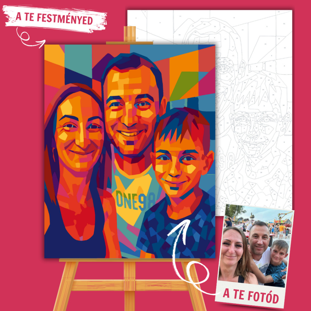 Lépj be a geometrikus színvilágba! Küldd be a fotódat, és mi azt egyedi WPAP stílusban alakítjuk át — egy színes, modern portrévá, amit te magad festhetsz meg! A WPAP (Wedha’s Pop Art Portrait) stílus geometrikus, színblokkokból álló vizuális látványvilágot teremt, ami rendkívül festőbarát. Ha valami igazán modern, dinamikus és különleges festményt szeretnél, ez a Te stílusod!