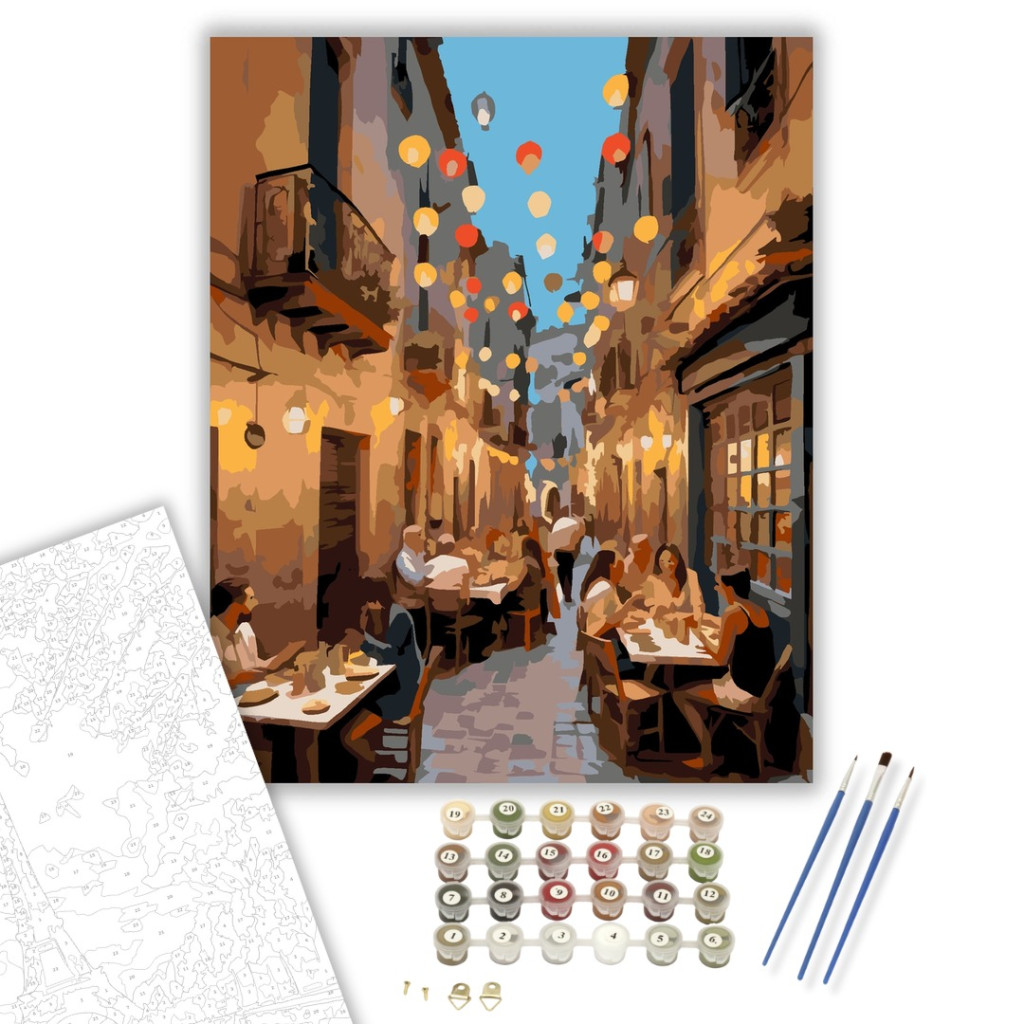 A festmény egy nyüzsgő tapas estét ábrázol egy szűk barcelonai sikátorban, ahol az emberek kis faasztaloknál nevetgélnek. A kép meleg, vibráló színekben pompázik, a fejük felett színes lampionokkal. Ez a jelenet a mediterrán életöröm és a baráti összejövetelek hangulatát közvetíti. Díszítsd otthonodat saját kézzel készített műalkotással, vagy ajándékozd meg szeretteidet egy igazán különleges élménnyel! A számfestő készletben minden szükséges eszköz megtalálható a festmény elkészítéséhez.