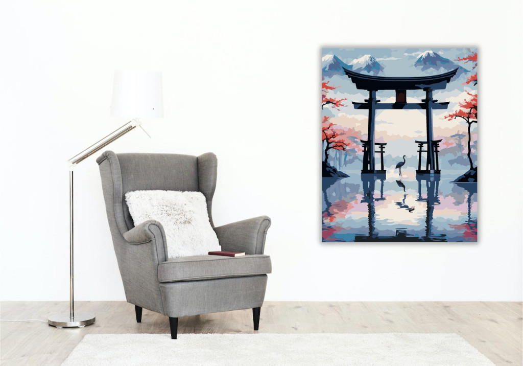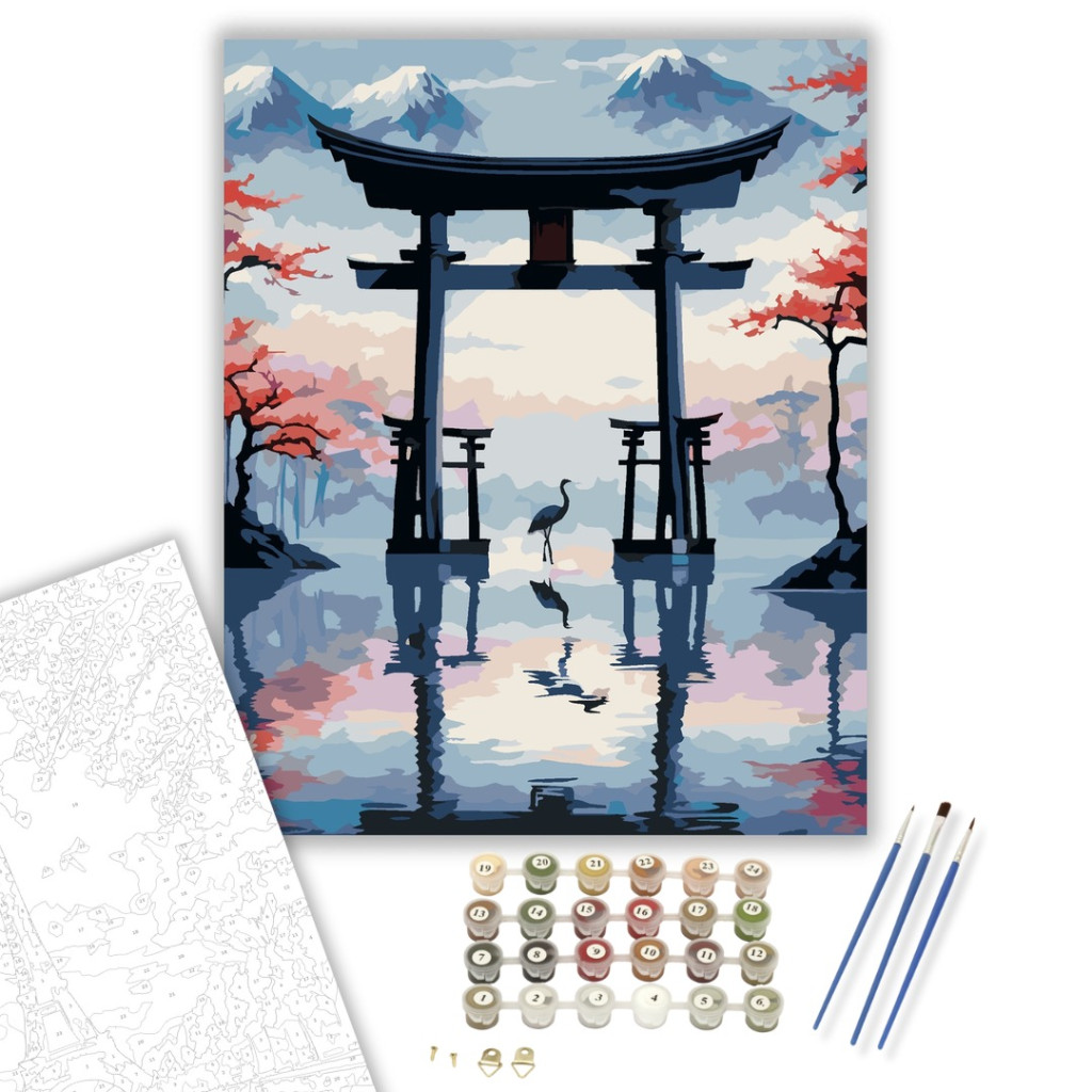 Torii Kapu és Darvak a Nyugalom Tükrében - számfestő készlet – 40×50 cm (Keretre feszítve)