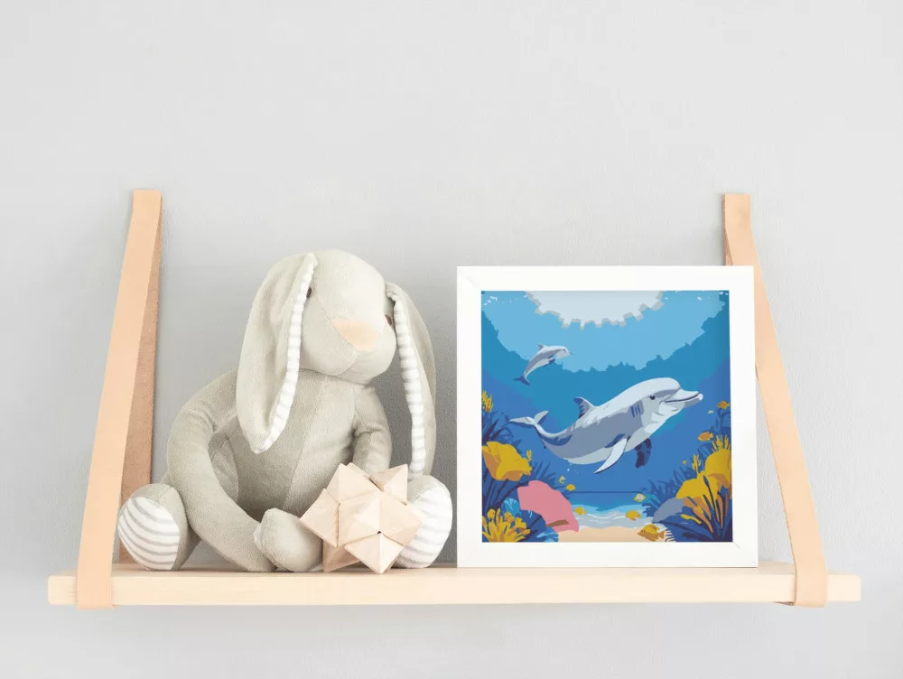 Ezen a képen két vidám delfin úszkál a kék tengerben, körülöttük színes korallok és halacskák táncolnak. A napsugarak vidáman csillognak a vízen, barátságos hangulatot teremtve. Tökéletes választás a gyerekek első tengeri kalandjához!