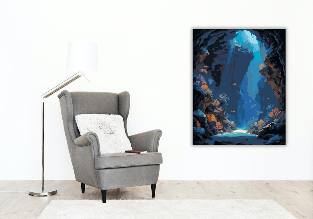 A festmény egy misztikus víz alatti barlangot ábrázol, ahol mélykék fény világítja meg a különös, világító korallokat és apró halakat. Az élénk kék, narancs és lila árnyalatok varázslatos, álomszerű hangulatot teremtenek. A kép egy rejtett világ felfedezésének izgalmát és a természet csodáinak lenyűgöző szépségét közvetíti. Díszítsd otthonodat saját kézzel készített műalkotással, vagy ajándékozd meg szeretteidet egy igazán különleges élménnyel! A számfestő készletben minden szükséges eszköz megtalálható a festmény elkészítéséhez.