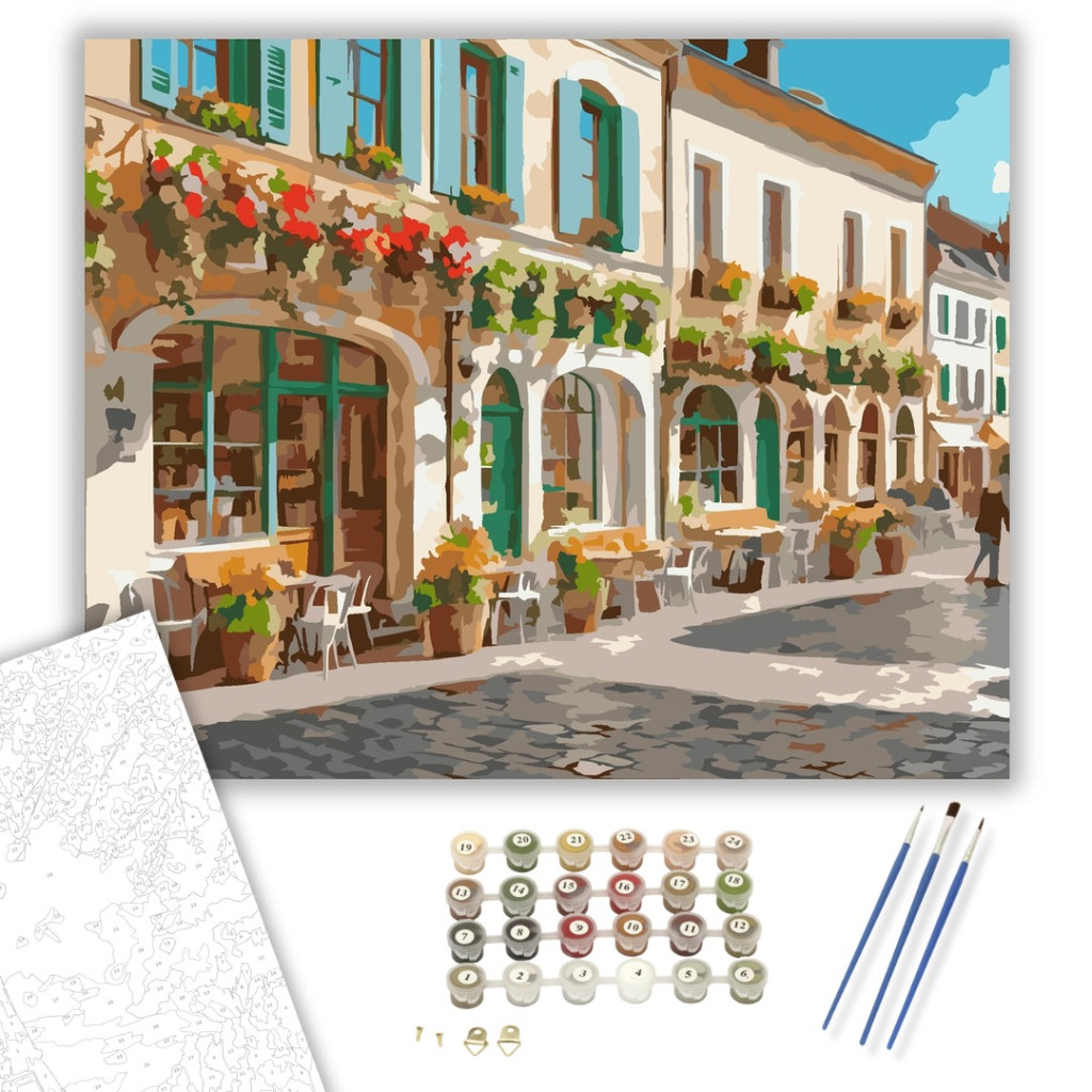 A festmény egy bájos városi teret ábrázol, ahol virágokkal díszített épületek és szabadtéri kávézók várják a látogatókat. A színes dekorációk és élénk virágkompozíciók vidám, élettel teli hangulatot sugároznak. A kép a tavaszi időszak derűs, pezsgő atmoszféráját idézi meg. Engedd szabadjára a kreativitásodat, és alkoss egy különleges műalkotást, amely otthonod dísze lehet de egyedi ajándékként is kiváló. A számfestő készletben minden szükséges eszközt megtalálsz a tökéletes végeredményhez.