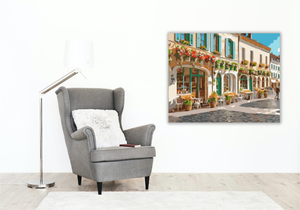 A festmény egy bájos városi teret ábrázol, ahol virágokkal díszített épületek és szabadtéri kávézók várják a látogatókat. A színes dekorációk és élénk virágkompozíciók vidám, élettel teli hangulatot sugároznak. A kép a tavaszi időszak derűs, pezsgő atmoszféráját idézi meg. Engedd szabadjára a kreativitásodat, és alkoss egy különleges műalkotást, amely otthonod dísze lehet de egyedi ajándékként is kiváló. A számfestő készletben minden szükséges eszközt megtalálsz a tökéletes végeredményhez.