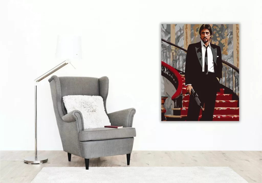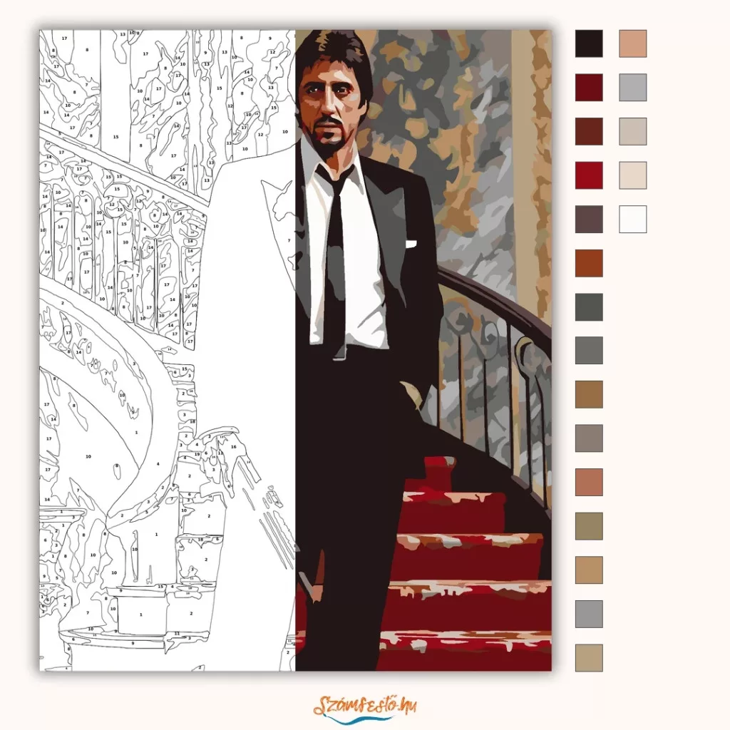 A képen Tony Montana áll egy díszes lépcső tetején, elegáns öltönyben, kezében fegyverrel. A márvány falak és a vörös szőnyeg luxust sugároznak, miközben a testtartása feszült és határozott. Tekintete kemény és elszánt, mintha egy végső pillanat küszöbén állna. A jelenet a hatalom, a bukás és a feszültség drámai találkozását mutatja. Engedd szabadjára a kreativitásodat, és alkoss egy különleges műalkotást, amely otthonod dísze lehet de egyedi ajándékként is kiváló. A számfestő készletben minden szükséges eszközt megtalálsz a tökéletes végeredményhez.