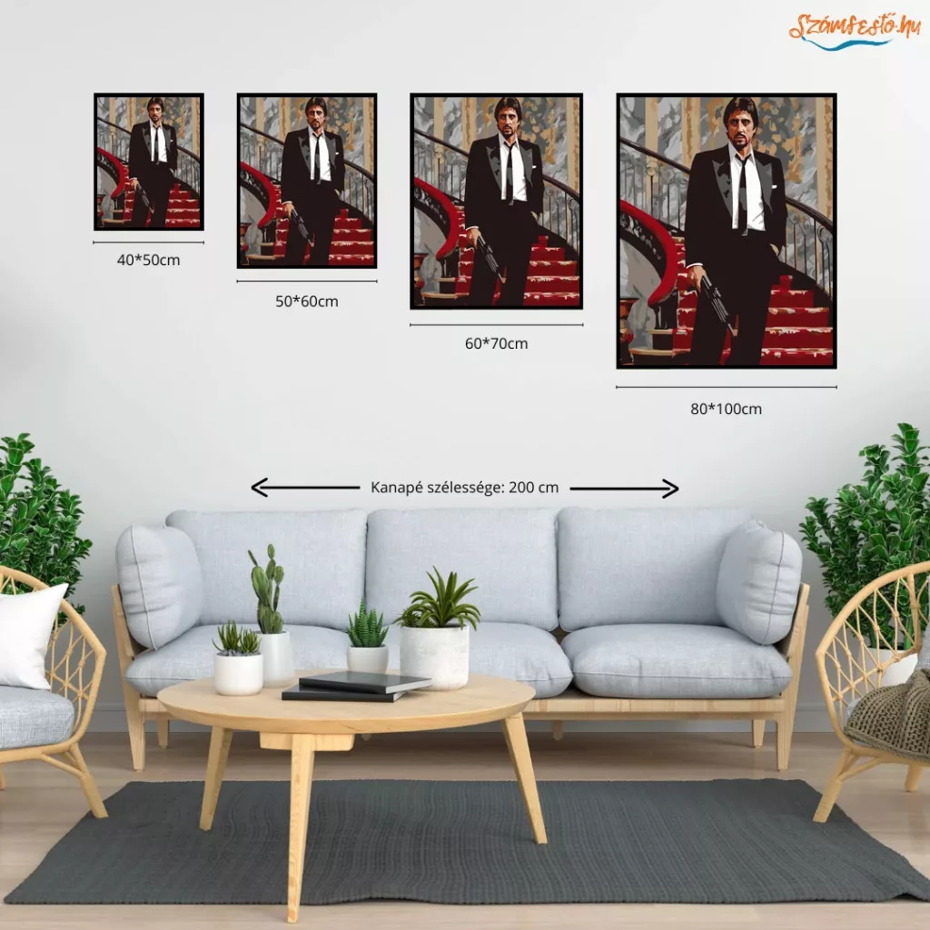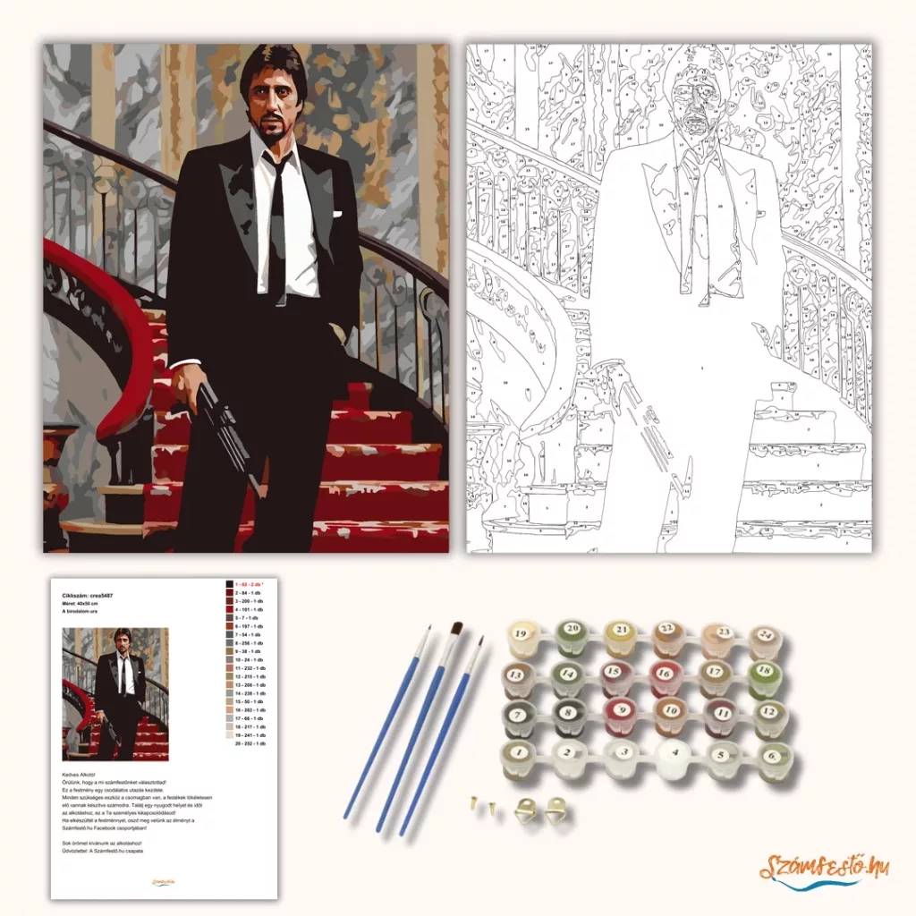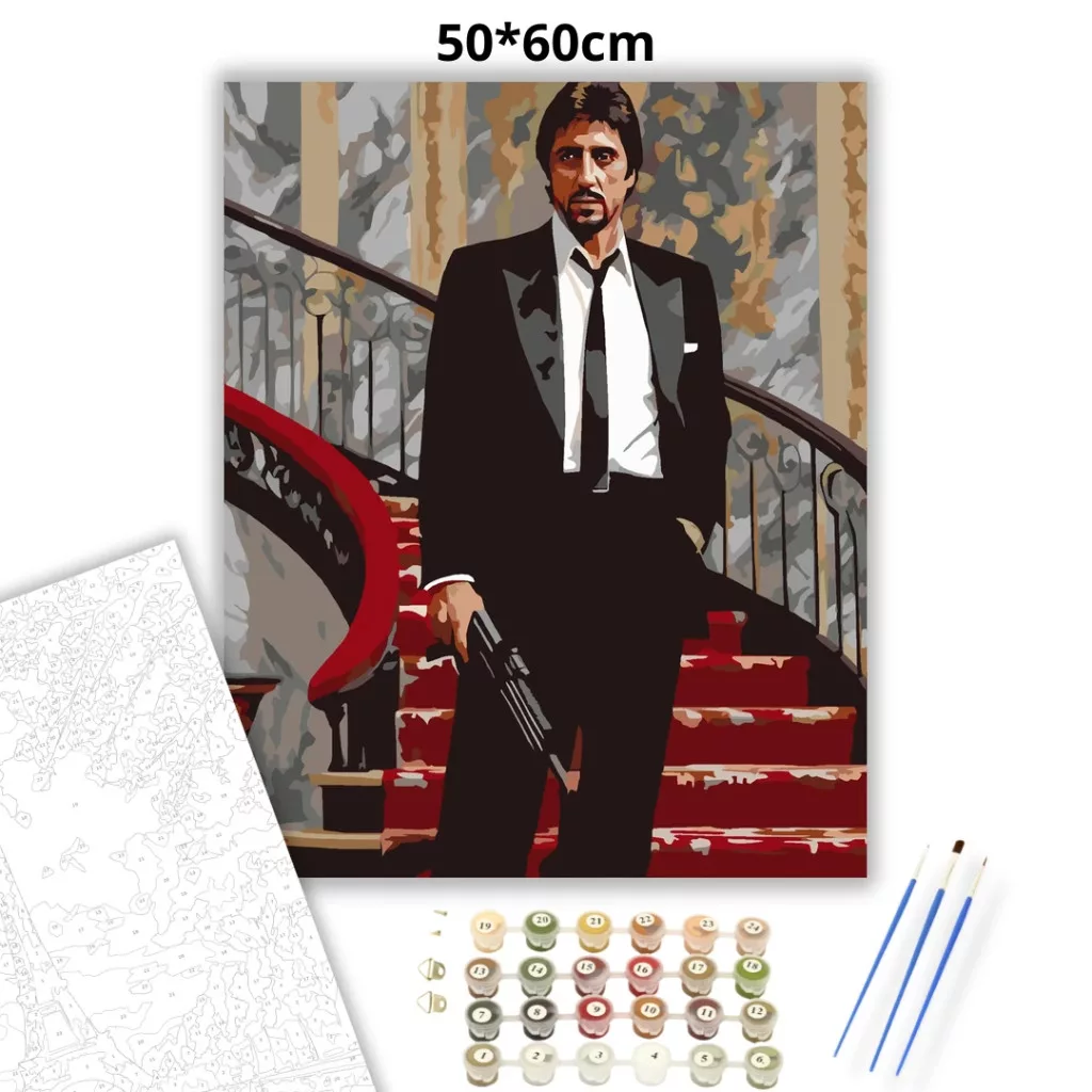 A képen Tony Montana áll egy díszes lépcső tetején, elegáns öltönyben, kezében fegyverrel. A márvány falak és a vörös szőnyeg luxust sugároznak, miközben a testtartása feszült és határozott. Tekintete kemény és elszánt, mintha egy végső pillanat küszöbén állna. A jelenet a hatalom, a bukás és a feszültség drámai találkozását mutatja. Varázsolj egyedi hangulatot otthonodba ezzel a gyönyörű számfestő készlettel, amely tökéletes ajándék is lehet szeretteid számára. A csomag mindent tartalmaz, amire szükséged van ahhoz, hogy saját kezűleg alkoss egy lenyűgöző festményt.
