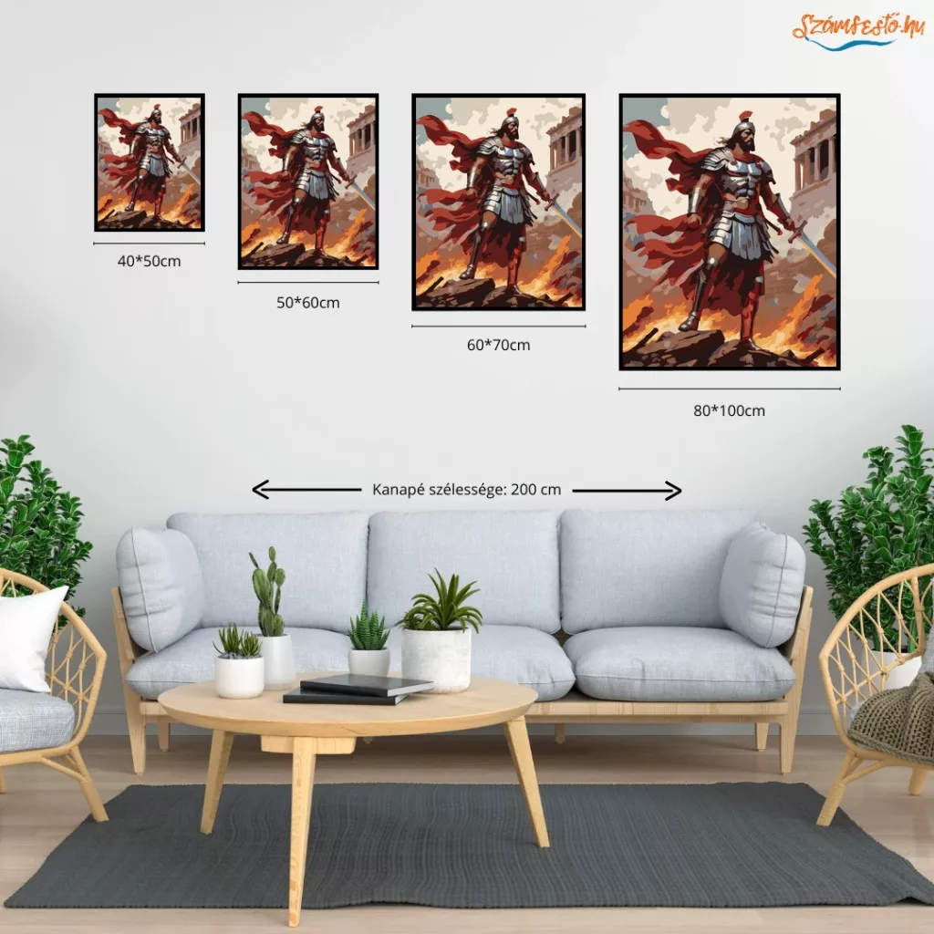 A képen egy páncélos római hadisten áll a csatatéren, kezében karddal, mögötte vörös zászlók lobognak a szélben. A füstös ég és a lángoló háttér erőteljes, drámai hangulatot ad. A romos épületek között a figura magabiztosan emelkedik ki a jelenetből. Díszítsd otthonodat saját kézzel készített műalkotással, vagy ajándékozd meg szeretteidet egy igazán különleges élménnyel! A számfestő készletben minden szükséges eszköz megtalálható a festmény elkészítéséhez.