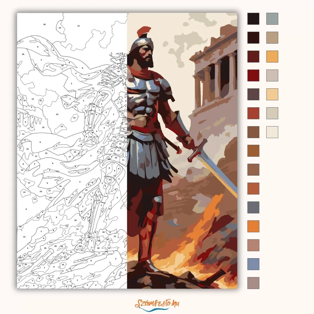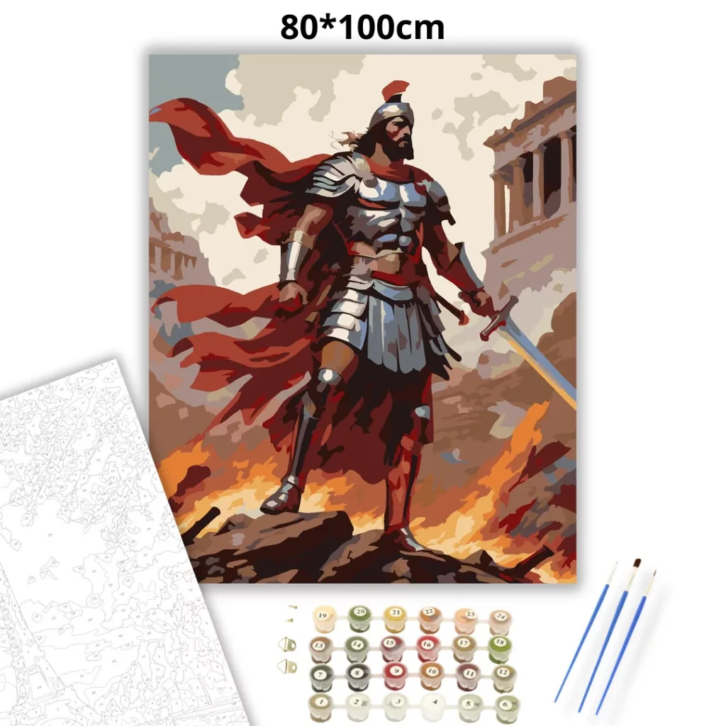 A képen egy páncélos római hadisten áll a csatatéren, kezében karddal, mögötte vörös zászlók lobognak a szélben. A füstös ég és a lángoló háttér erőteljes, drámai hangulatot ad. A romos épületek között a figura magabiztosan emelkedik ki a jelenetből. Legyen a lakásod dísze vagy egy kedves meglepetés valaki számára – ez a számfestő készlet tökéletes választás mindkettőre. A készletben mindent megtalálsz, amivel lépésről lépésre megalkotható ez a gyönyörű festmény.