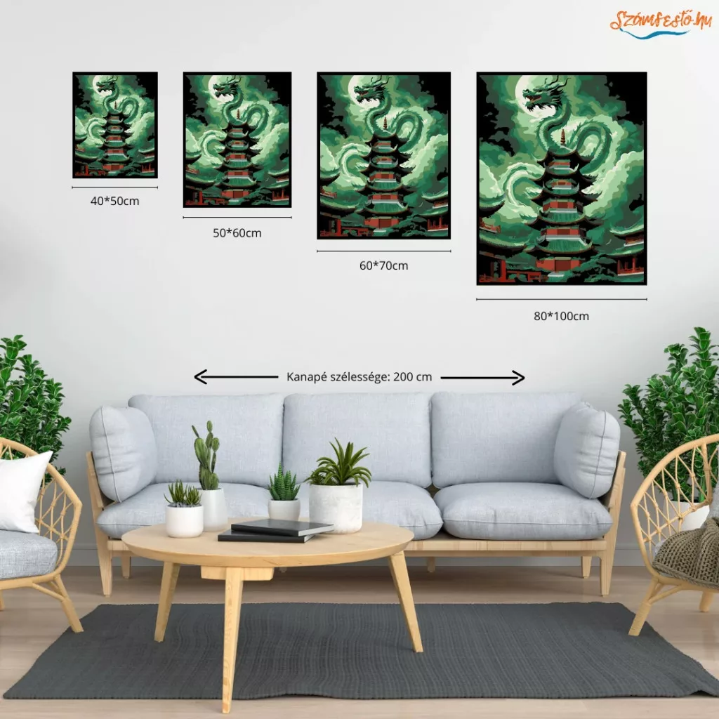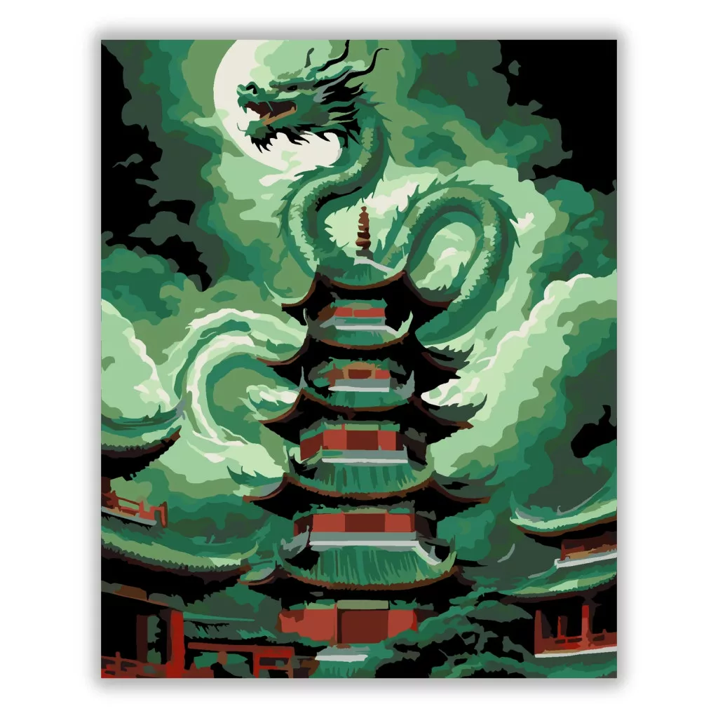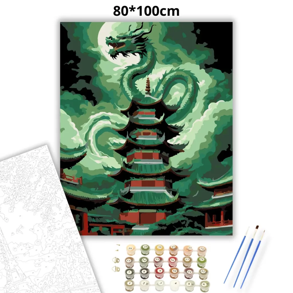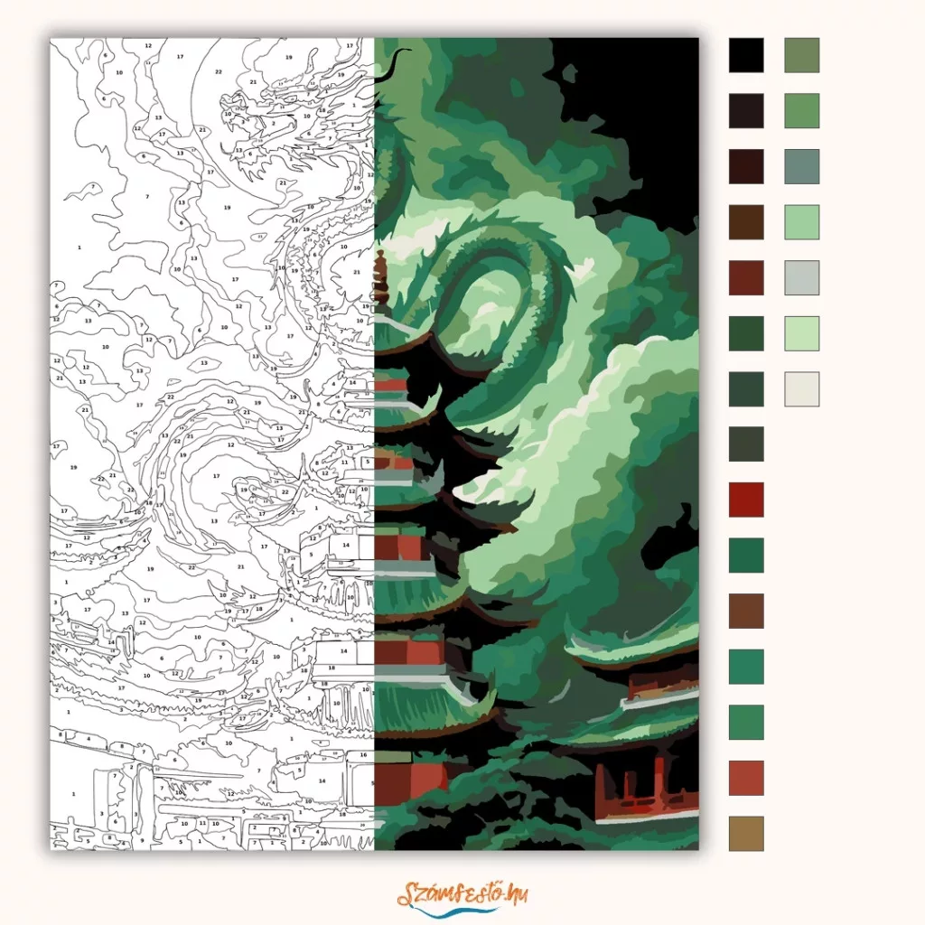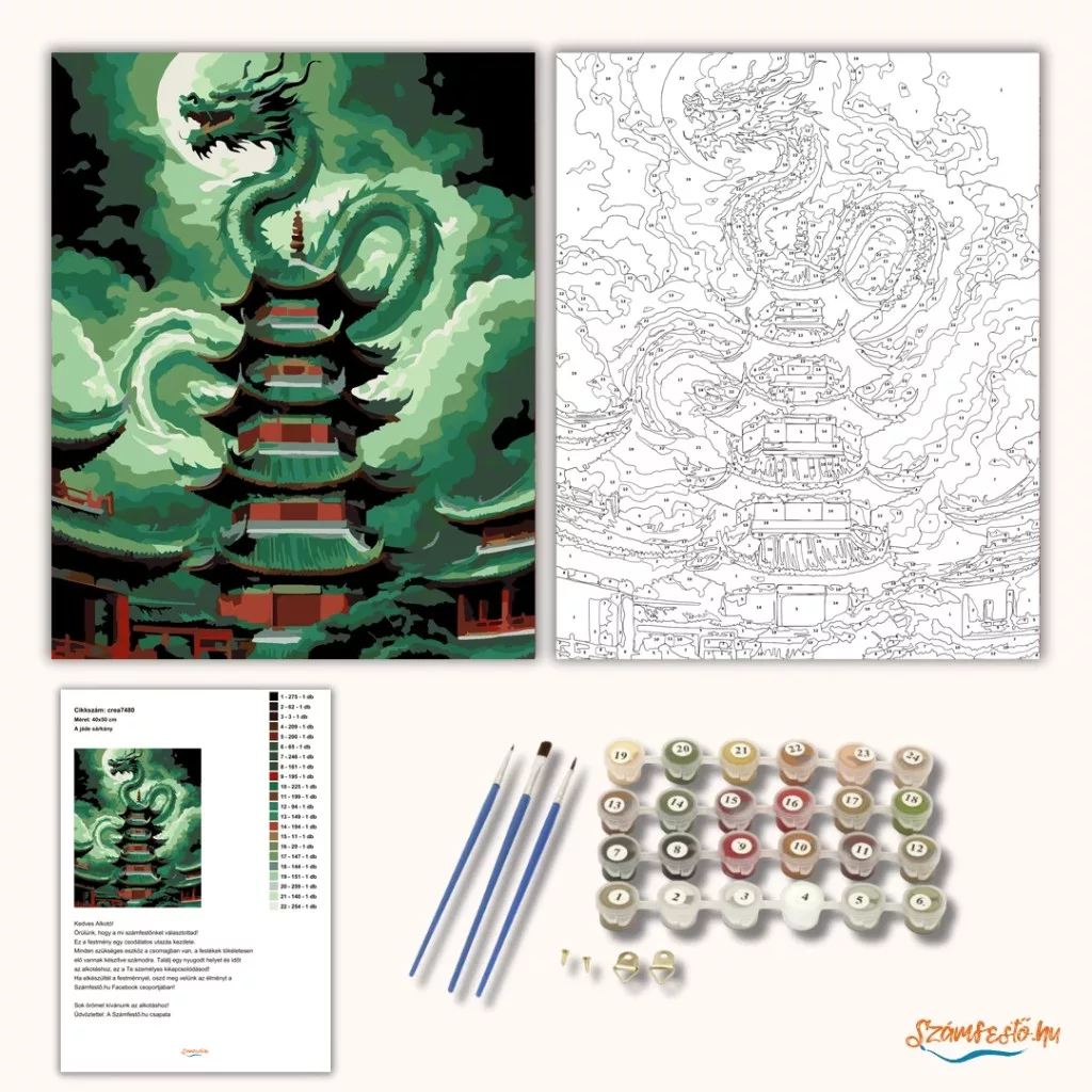 A képen egy kínai sárkány tekeredik egy ősi pagoda köré, miközben sűrű, örvénylő viharfelhők veszik körül. A sárkány a magasba fordulva tátott szájjal uralja a jelenetet, a pagoda pedig erős, misztikus hangulatot ad. A zöldes tónusok és a sötét árnyak drámai, viharos légkört teremtenek. Legyen a lakásod dísze vagy egy kedves meglepetés valaki számára – ez a számfestő készlet tökéletes választás mindkettőre. A készletben mindent megtalálsz, amivel lépésről lépésre megalkotható ez a gyönyörű festmény.