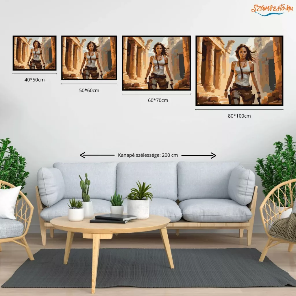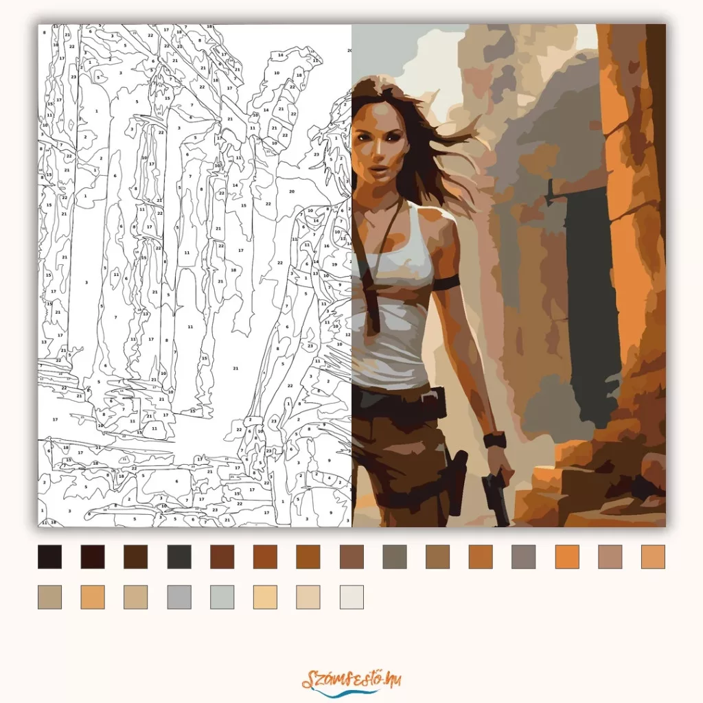 A képen egy elszánt nő halad előre ősi romok között, mindkét kezében fegyverrel. Ruházata praktikus és harcra kész, mozdulata határozott és lendületes. A háttérben omladozó kőépítmények és meleg, aranyló fények jelennek meg, amelyek kalandos, felfedező hangulatot teremtenek. A jelenet dinamizmust, bátorságot és túlélési ösztönt sugároz. Ez a számfestő készlet tökéletes választás, ha egyedi dekorációval tennéd szebbé otthonodat, vagy ha különleges ajándékot keresel. A csomagban minden megtalálható, amire a festéshez szükséged van.