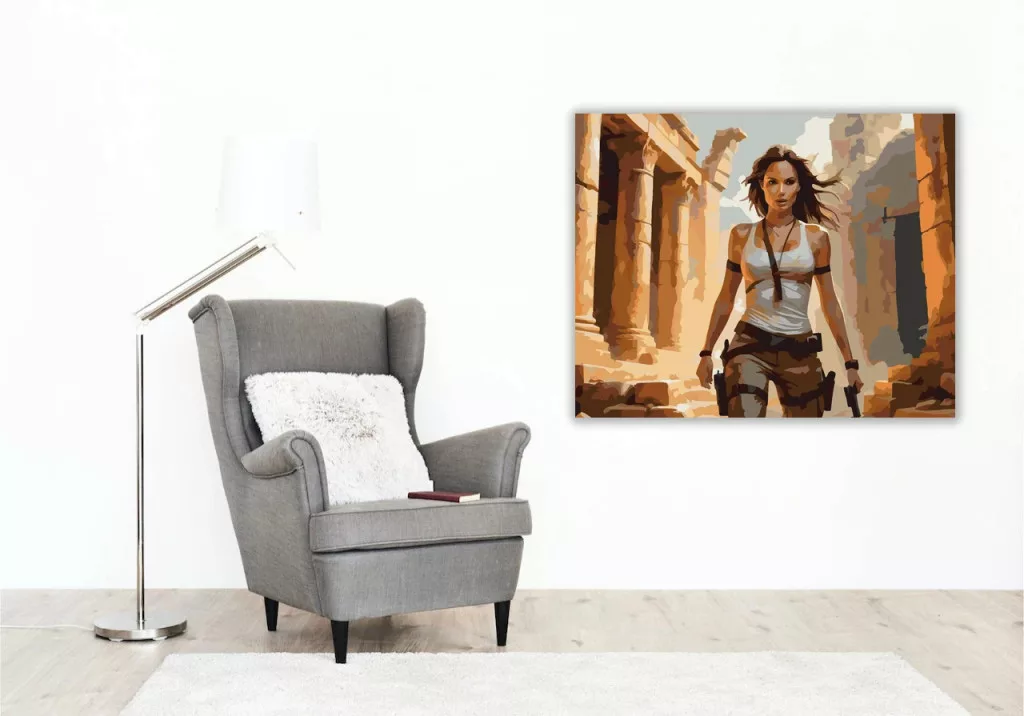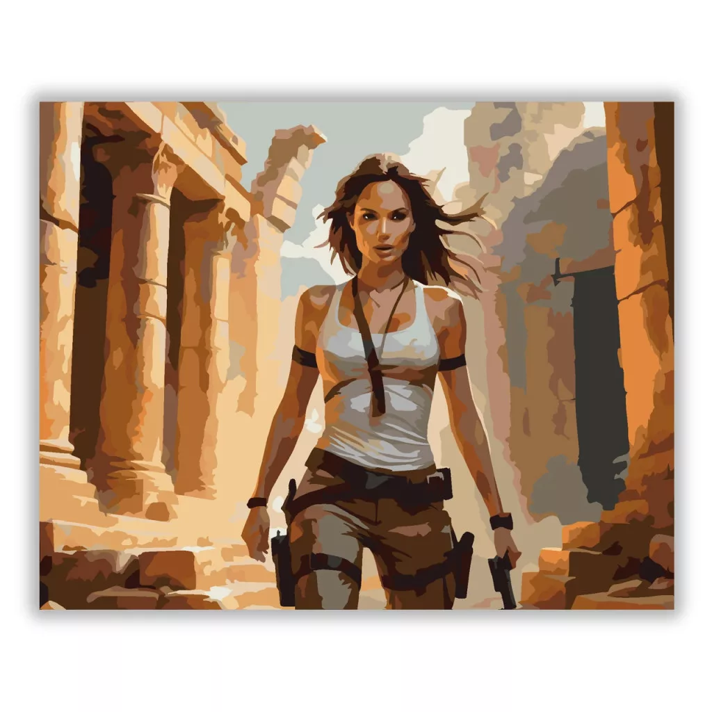 A képen egy elszánt nő halad előre ősi romok között, mindkét kezében fegyverrel. Ruházata praktikus és harcra kész, mozdulata határozott és lendületes. A háttérben omladozó kőépítmények és meleg, aranyló fények jelennek meg, amelyek kalandos, felfedező hangulatot teremtenek. A jelenet dinamizmust, bátorságot és túlélési ösztönt sugároz. Engedd szabadjára a kreativitásodat, és alkoss egy különleges műalkotást, amely otthonod dísze lehet de egyedi ajándékként is kiváló. A számfestő készletben minden szükséges eszközt megtalálsz a tökéletes végeredményhez.