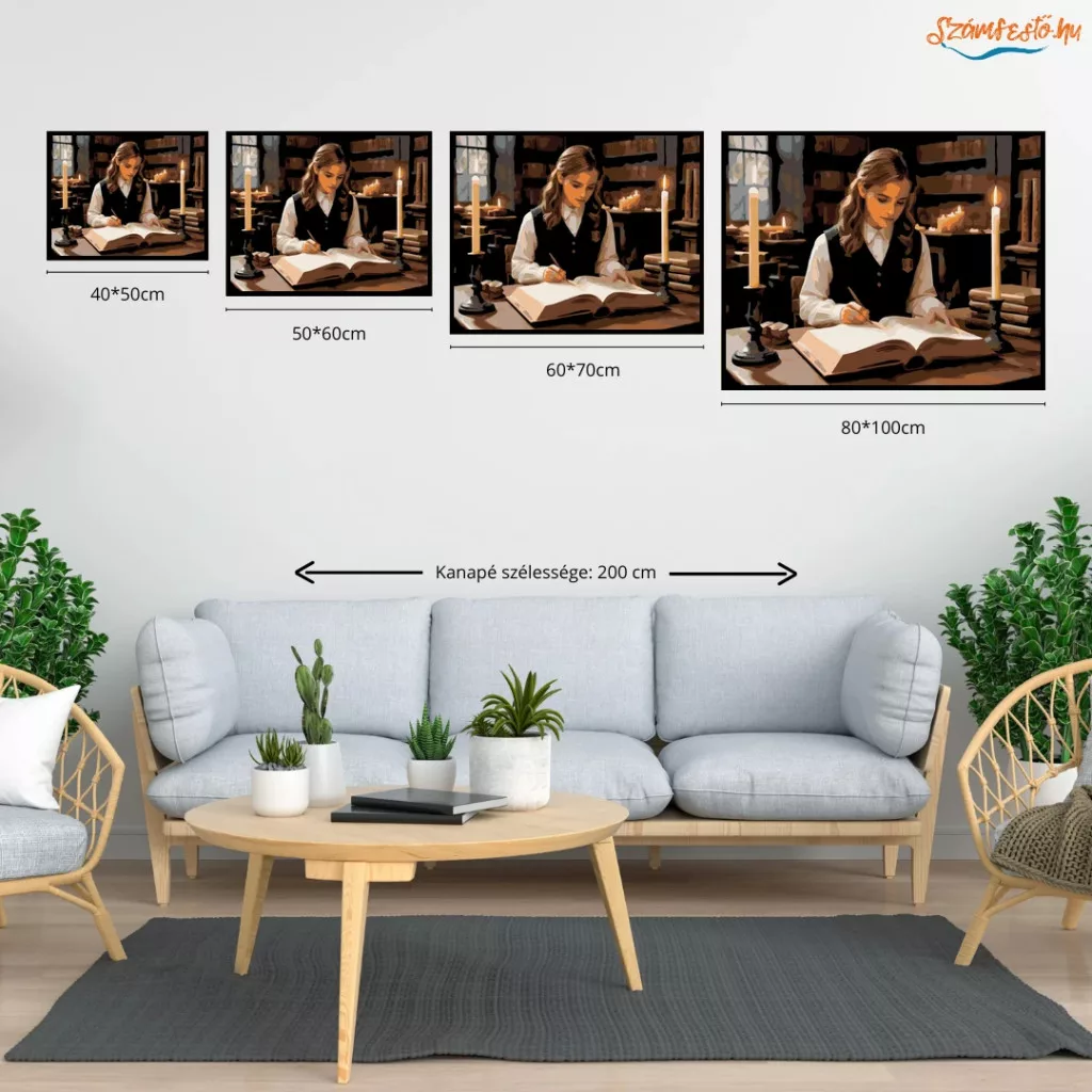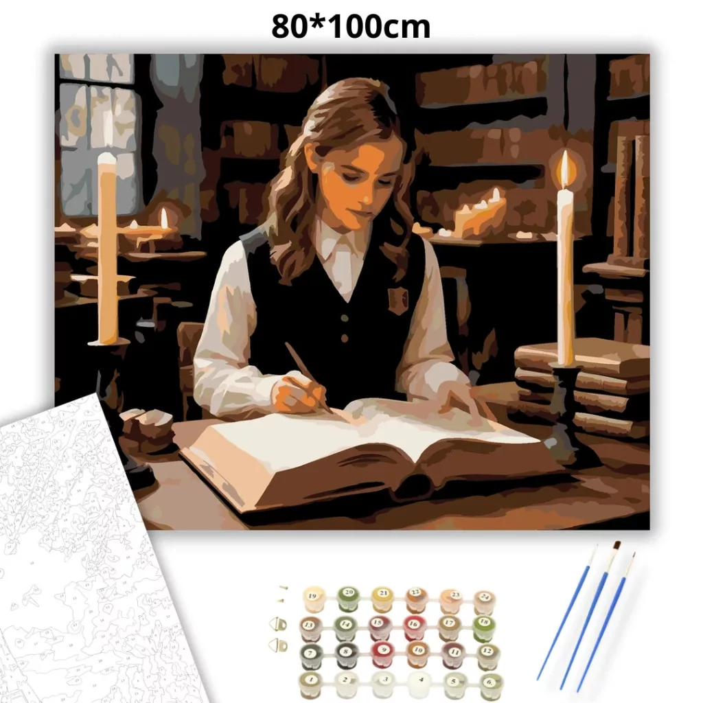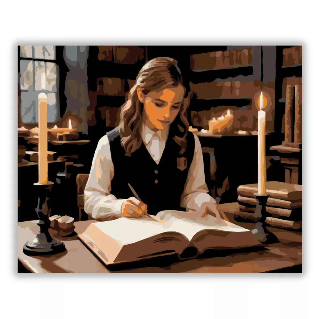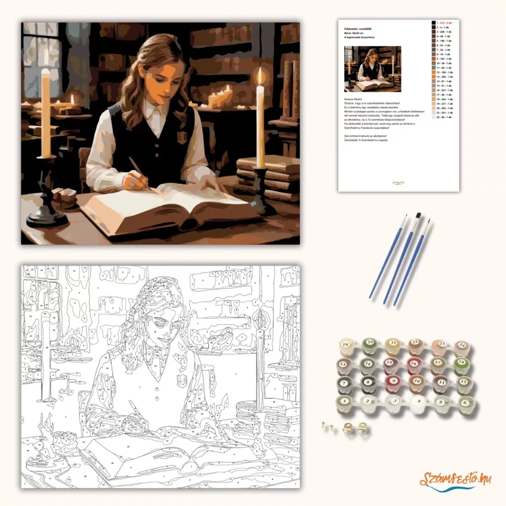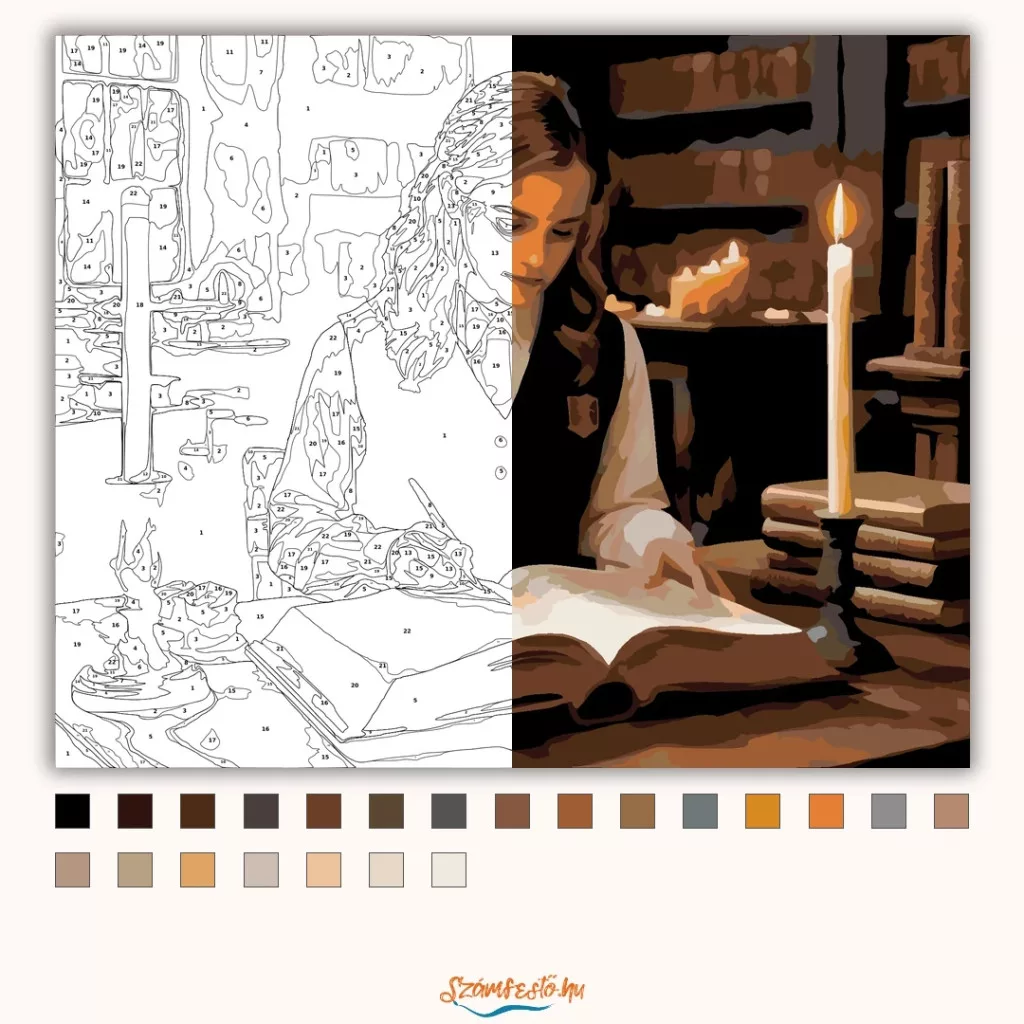 A képen egy fiatal boszorkány látható, amint egy gyertyafényes könyvtárban ül és egy vastag, ősi könyvet tanulmányoz. A lapokon halványan izzó rúnák jelennek meg, miközben körülötte lebegő gyertyák világítják meg a teret. A jelenet nyugodt, mégis mágikus hangulatú, a tudás és a varázslat iránti mély elkötelezettséget sugározza. Ez a számfestő készlet tökéletes választás, ha egyedi dekorációval tennéd szebbé otthonodat, vagy ha különleges ajándékot keresel. A csomagban minden megtalálható, amire a festéshez szükséged van.