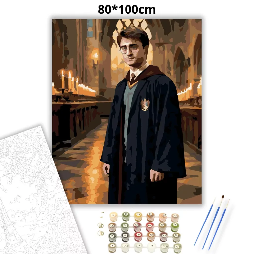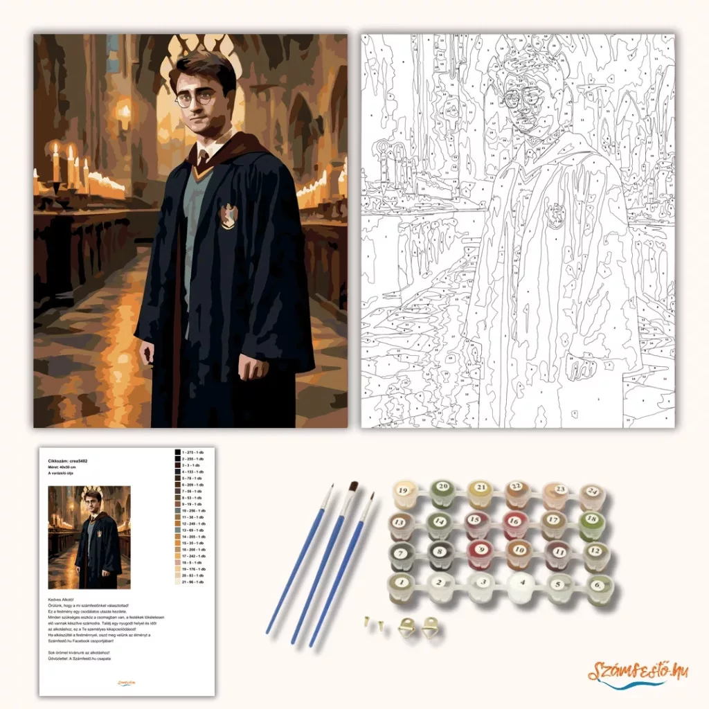 A képen egy varázsló fiú áll a kastély nagytermében, kezében pálcával, körülötte lebegő gyertyák világítják meg a teret. A hatalmas csarnok meleg fényei és a hosszú asztalok nyugodt, mégis ünnepélyes hangulatot teremtenek. Az alak egyedül áll, tekintete komoly és elmélyült, a jelenet a csendes elszántság és a varázslatokkal teli világ súlyát sugározza. Ez a számfestő készlet tökéletes választás, ha egyedi dekorációval tennéd szebbé otthonodat, vagy ha különleges ajándékot keresel. A csomagban minden megtalálható, amire a festéshez szükséged van.