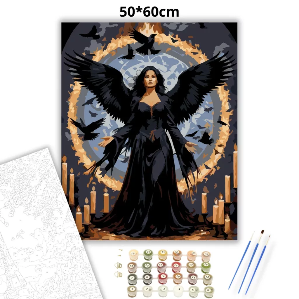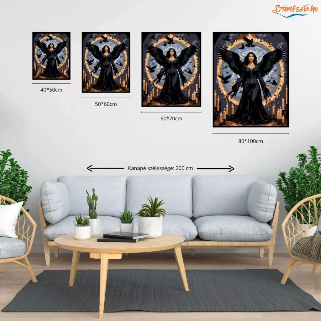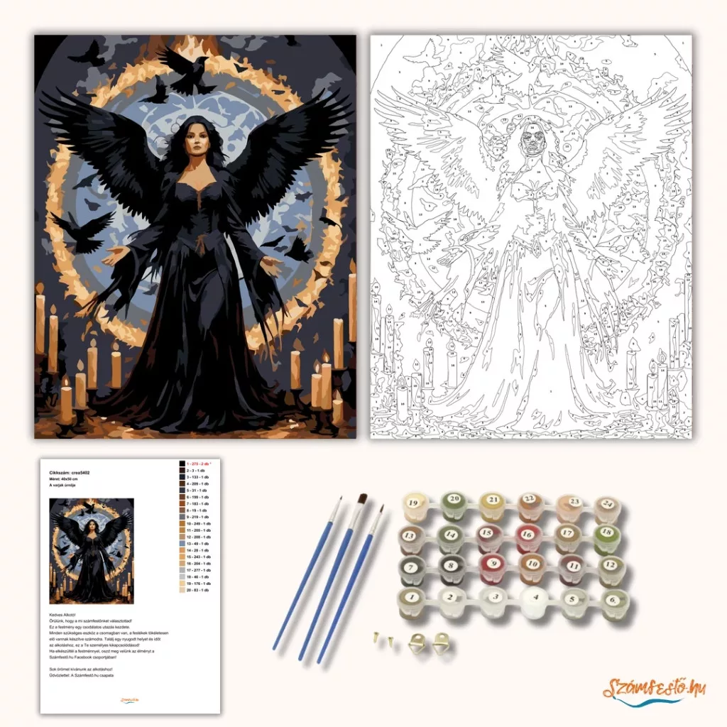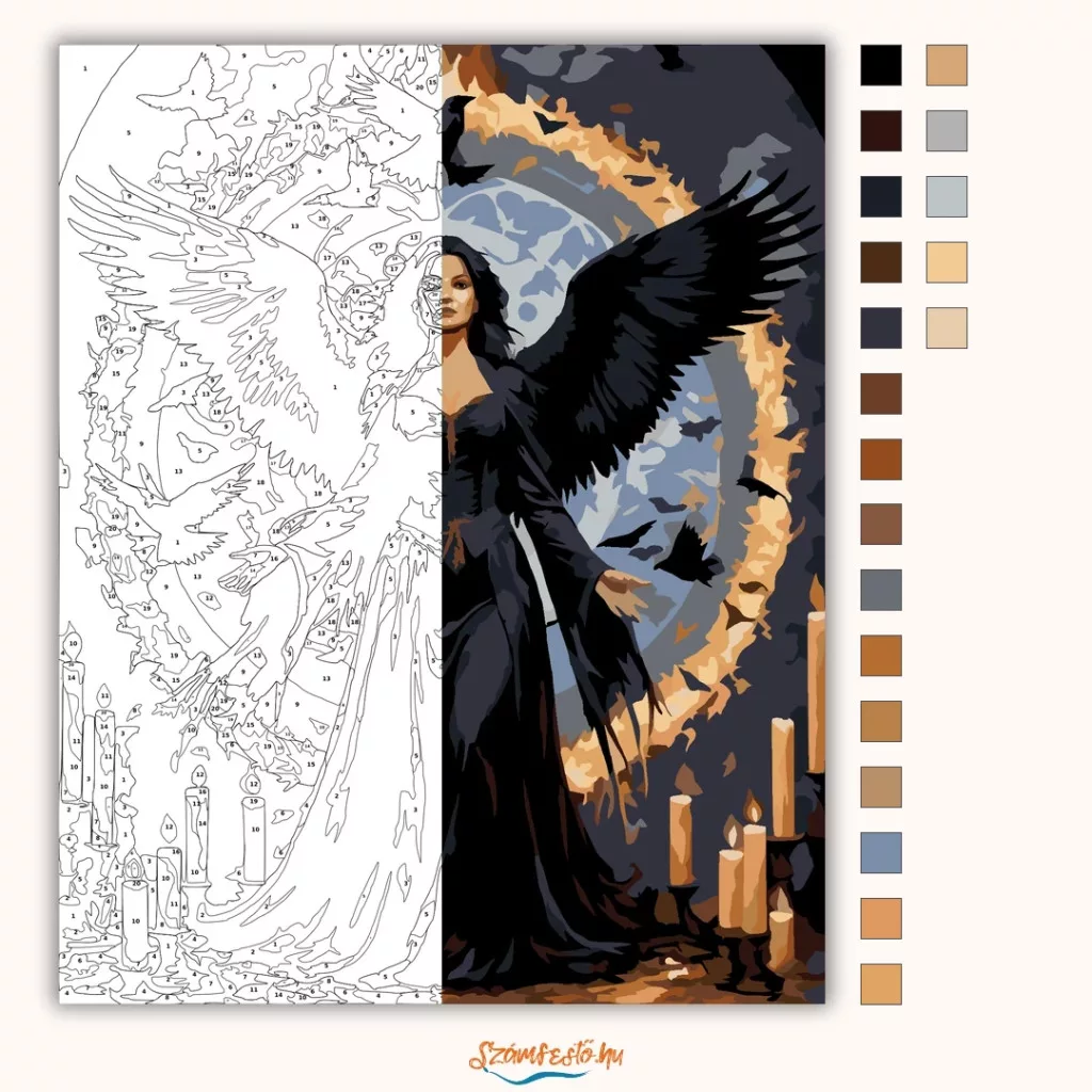 A képen egy gótikus boszorkány áll fekete, hollószárnyakkal. Körülötte gyertyák égnek, mögötte pedig egy fénylő, mágikus kör rajzolódik ki. A sötét háttérben hollók repülnek, miközben tollak kavarognak a levegőben. A kép titokzatos, varázslatos hangulatot áraszt, erős fény-árnyék hatással. Engedd szabadjára a kreativitásodat, és alkoss egy különleges műalkotást, amely otthonod dísze lehet de egyedi ajándékként is kiváló. A számfestő készletben minden szükséges eszközt megtalálsz a tökéletes végeredményhez.