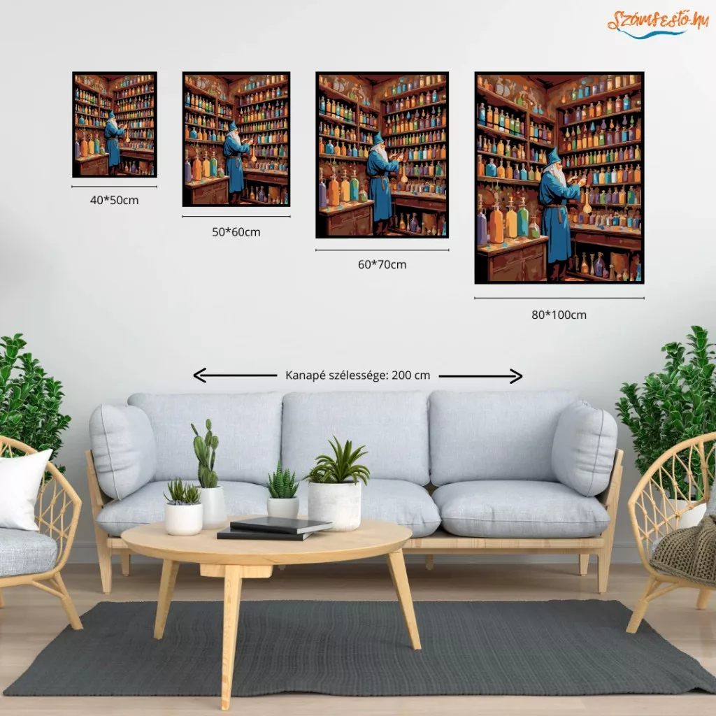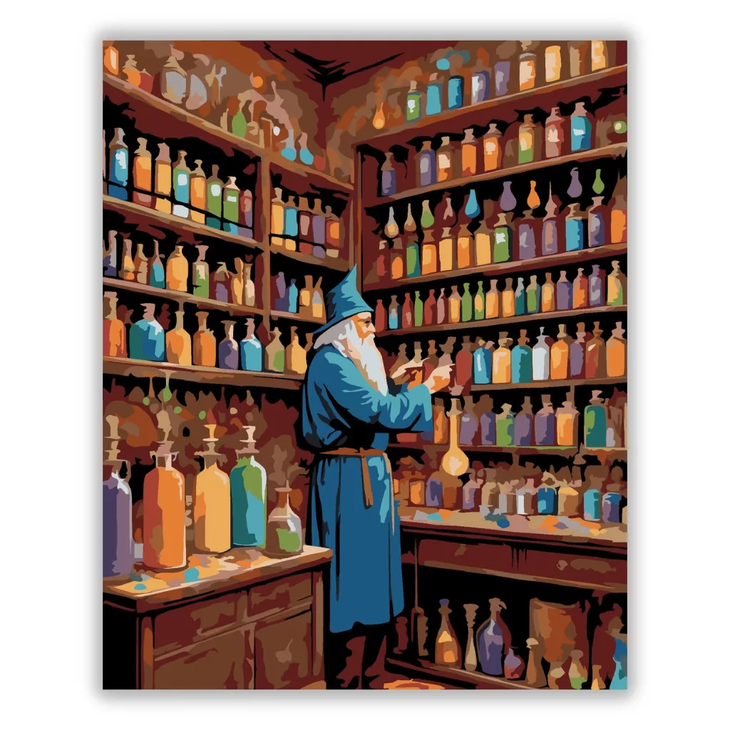A képen egy föld alatti varázslabor látható, ahol egy hosszú szakállú varázsló a polcok között egy üvegben lévő folyadékkal foglalatoskodik. A falakat és asztalokat rengeteg, különböző formájú üvegpalack és lombik tölti meg. A meleg, füstös hangulat és a sok színes üveg titokzatos, mesés világot idéz. Engedd szabadjára a kreativitásodat, és alkoss egy különleges műalkotást, amely otthonod dísze lehet de egyedi ajándékként is kiváló. A számfestő készletben minden szükséges eszközt megtalálsz a tökéletes végeredményhez.