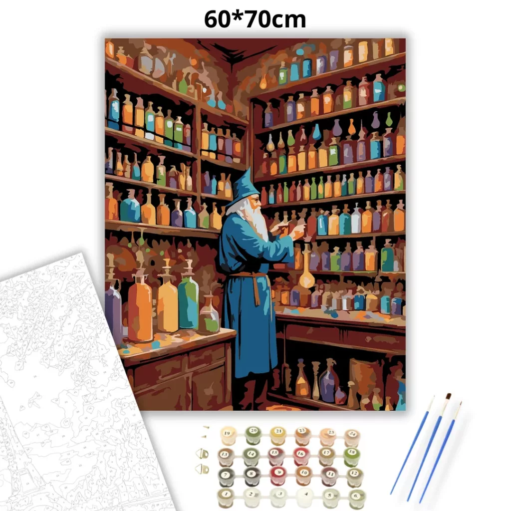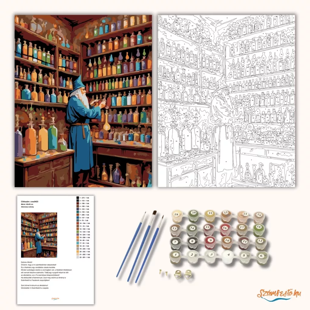 A képen egy föld alatti varázslabor látható, ahol egy hosszú szakállú varázsló a polcok között egy üvegben lévő folyadékkal foglalatoskodik. A falakat és asztalokat rengeteg, különböző formájú üvegpalack és lombik tölti meg. A meleg, füstös hangulat és a sok színes üveg titokzatos, mesés világot idéz. Varázsolj egyedi hangulatot otthonodba ezzel a gyönyörű számfestő készlettel, amely tökéletes ajándék is lehet szeretteid számára. A csomag mindent tartalmaz, amire szükséged van ahhoz, hogy saját kezűleg alkoss egy lenyűgöző festményt.