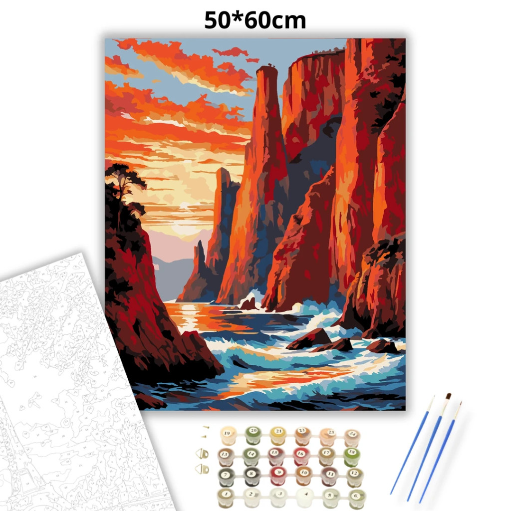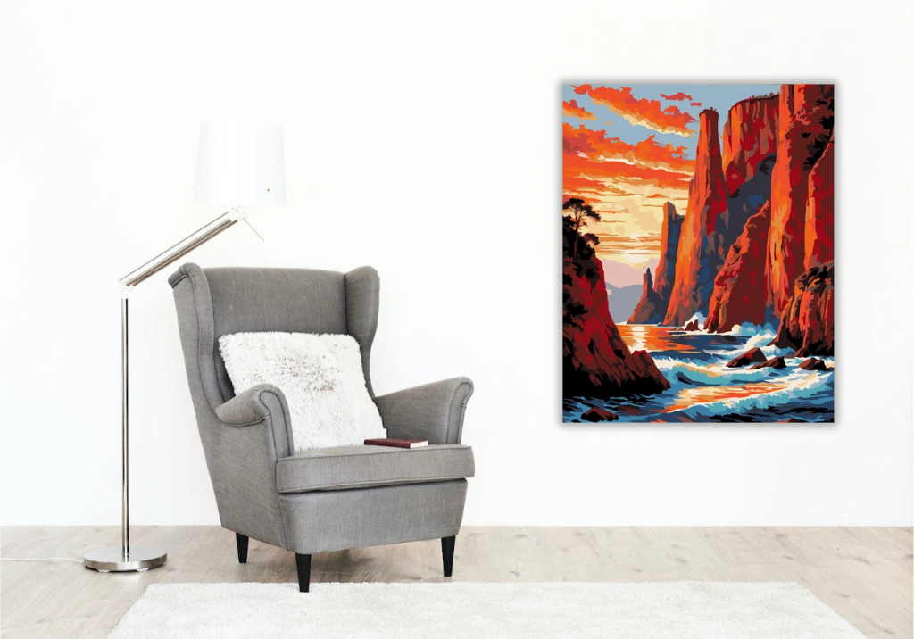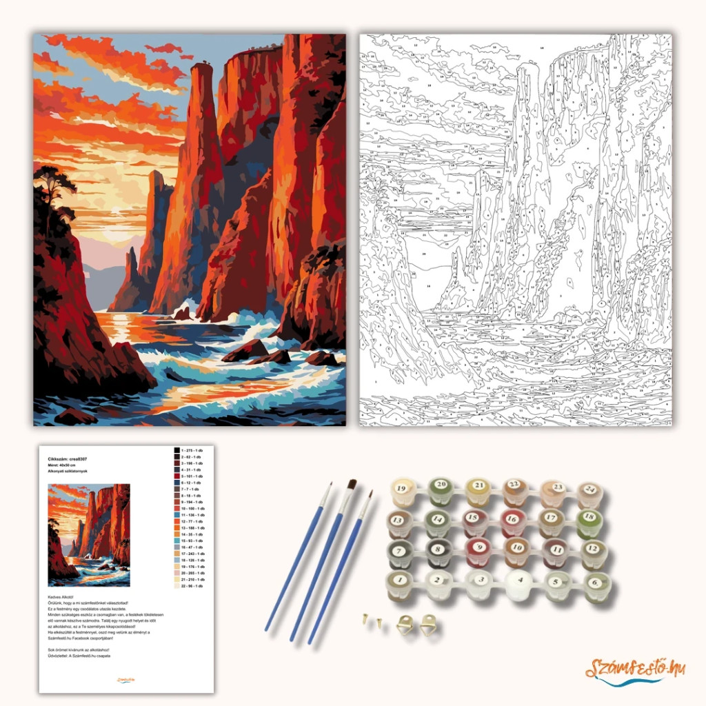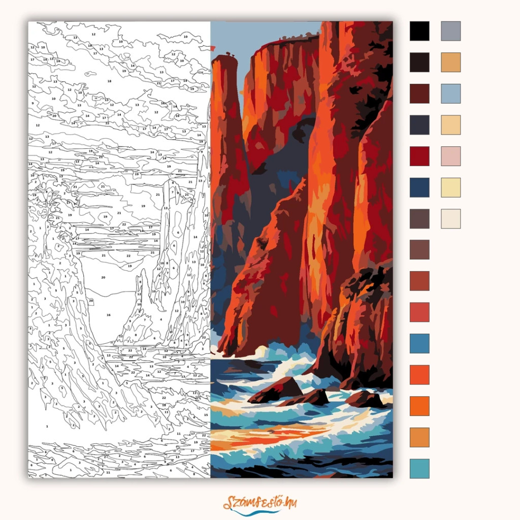 A képen hatalmas, meredek sziklák emelkednek a tenger fölé, miközben a hullámok a part menti kövekhez csapódnak. A naplemente narancsos-vörös fénye izzó hangulatot ad a tájnak, a távolban pedig hegyek sejlenek fel. Látványos, energikus tengerparti jelenet, ami otthonodba is elhozza a természet erejét. Varázsolj egyedi hangulatot otthonodba ezzel a gyönyörű számfestő készlettel, amely tökéletes ajándék is lehet szeretteid számára. A csomag mindent tartalmaz, amire szükséged van ahhoz, hogy saját kezűleg alkoss egy lenyűgöző festményt.