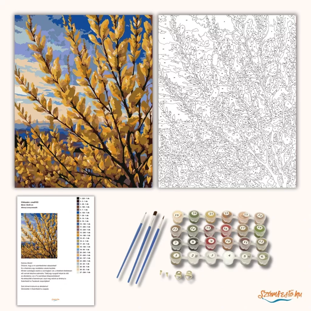 A képen aranyvessző ágai töltik ki a látványt, a háttérben esti égbolttal és távoli hegyekkel. A sárgás virágok és a mélyebb kék árnyalatok romantikus, nyugodt hangulatot teremtenek. Természetkedvelőknek különösen szép, tavaszias falidísz lehet. Engedd szabadjára a kreativitásodat, és alkoss egy különleges műalkotást, amely otthonod dísze lehet de egyedi ajándékként is kiváló. A számfestő készletben minden szükséges eszközt megtalálsz a tökéletes végeredményhez.