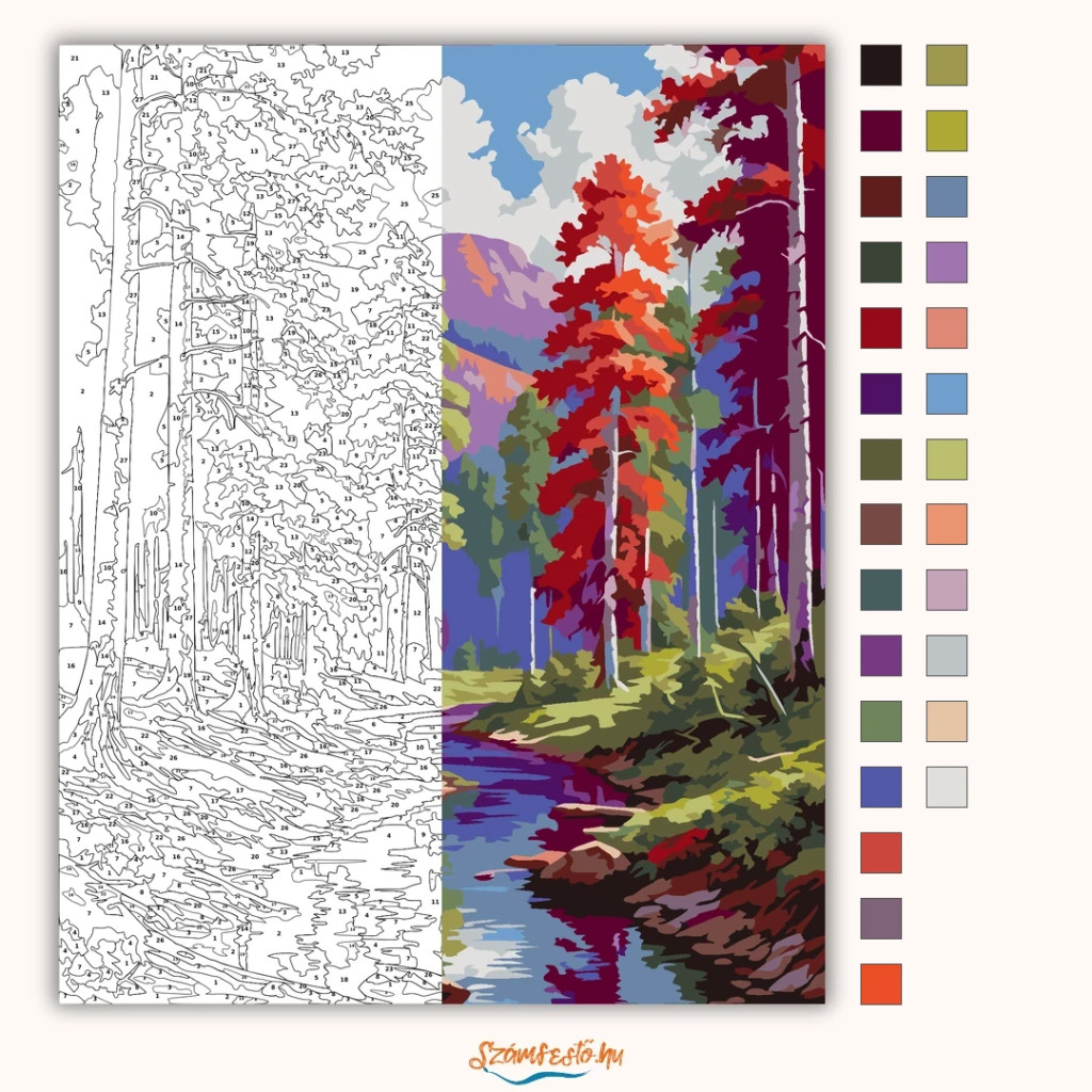 A képen egy erdei patak kanyarog a fák között, a távolban hegyekkel a látóhatáron. A táj merész, szokatlan színekben jelenik meg: lila törzsek és élénk vörös lombok keretezik a nyugodt víztükröt. Friss, álomszerű hangulatú kép, ami különleges színvilágával azonnal magára vonja a figyelmet. Varázsolj egyedi hangulatot otthonodba ezzel a gyönyörű számfestő készlettel, amely tökéletes ajándék is lehet szeretteid számára. A csomag mindent tartalmaz, amire szükséged van ahhoz, hogy saját kezűleg alkoss egy lenyűgöző festményt.
