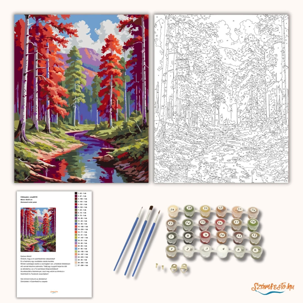 A képen egy erdei patak kanyarog a fák között, a távolban hegyekkel a látóhatáron. A táj merész, szokatlan színekben jelenik meg: lila törzsek és élénk vörös lombok keretezik a nyugodt víztükröt. Friss, álomszerű hangulatú kép, ami különleges színvilágával azonnal magára vonja a figyelmet. Ez a számfestő készlet tökéletes választás, ha egyedi dekorációval tennéd szebbé otthonodat, vagy ha különleges ajándékot keresel. A csomagban minden megtalálható, amire a festéshez szükséged van.
