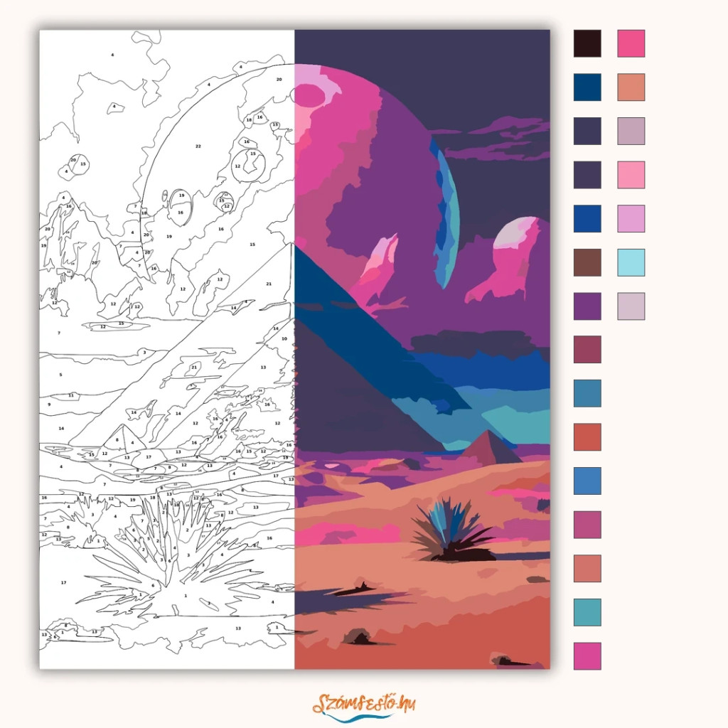 A képen egy futurisztikus sivatag látható, lila égbolttal és a távolban derengő türkiz piramisokkal. A tájat egy hatalmas, kráteres égitest uralja, amely különleges, álomszerű hangulatot ad a jelenetnek. A homokdűnék között szúrós sivatagi növények és sziklák teszik teljessé a látványt. Ez a számfestő készlet tökéletes választás, ha egyedi dekorációval tennéd szebbé otthonodat, vagy ha különleges ajándékot keresel. A csomagban minden megtalálható, amire a festéshez szükséged van.