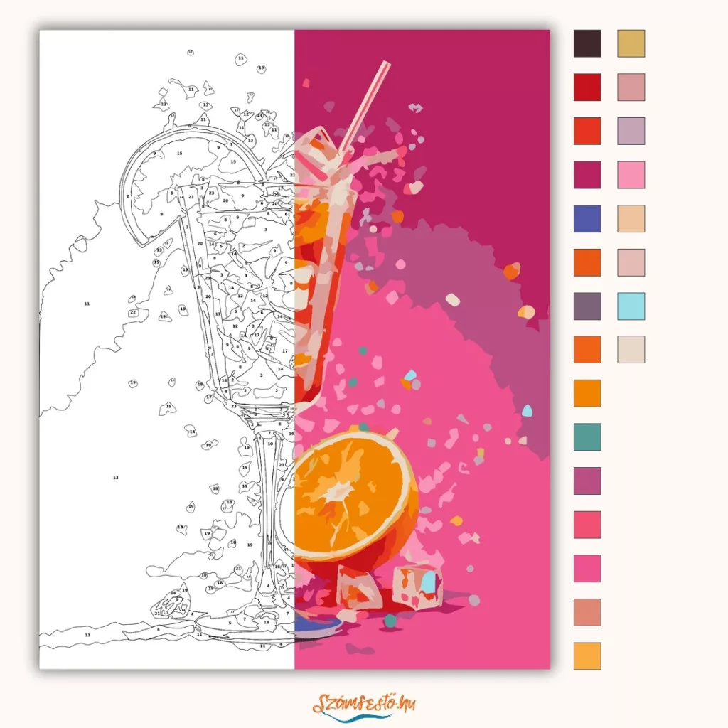 A képen egy Aperol Spritz koktél látható magas pohárban, jégkockákkal és narancsszelettel díszítve. A vibráló, rózsaszín háttérben csillogó szórások teszik még vidámabbá a látványt. Friss, nyári hangulatú kép, ami feldobja a konyhát vagy a nappalit. Engedd szabadjára a kreativitásodat, és alkoss egy különleges műalkotást, amely otthonod dísze lehet de egyedi ajándékként is kiváló. A számfestő készletben minden szükséges eszközt megtalálsz a tökéletes végeredményhez.