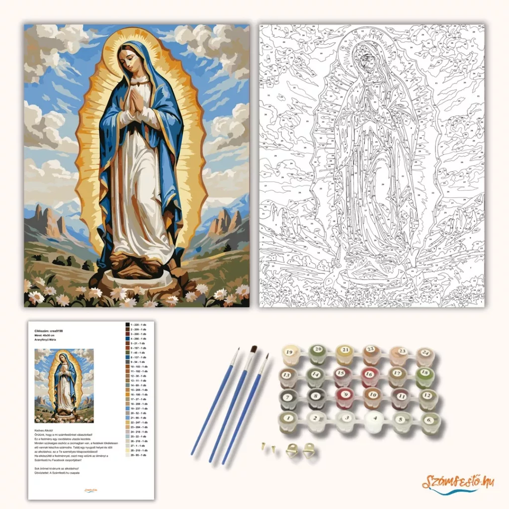 A képen Szűz Mária látható összetett kézzel, fehér ruhában és kék palástban, ragyogó fénykoszorúval körülvéve. A háttérben felhős ég és hegyes táj jelenik meg, az előtérben virágokkal. Nyugodt, áhítatos hangulatú jelenet meleg arany és hűvös égkék árnyalatokkal. Ez a számfestő készlet tökéletes választás, ha egyedi dekorációval tennéd szebbé otthonodat, vagy ha különleges ajándékot keresel. A csomagban minden megtalálható, amire a festéshez szükséged van.